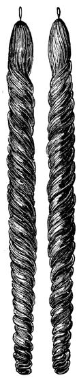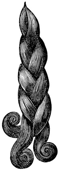 Curled hair of ten, twelve, fourteen, and sixteen inches long, is most in request, but longer or shorter can be curled, if required. I have already described a piece of hard wood called a “jigger” projecting from the work-table, and some of the other requirements for “piping” or curling hair. 27These I will suppose have been provided, and sundry locks of hair selected. Take one of the pieces, say, for the sake of illustration, weighing about a quarter of an ounce, and see that it is well and securely tied. Moisten the right hand, and rub the roots together to cause the hair to “felt,” and prevent the tie slipping. Place the tied part on the “jigger,” hold it by means of the string which passes through, and press tight with the foot. By this means the hair is, as it were, held in a vice. Comb it out and divide in two portions. Take one of the pieces of willow, cane, or whatever may be employed for the purpose, technically called a “pipe,” and a piece of rather stiff paper about 3 inches by 2. Put the “pipe” upon the hair, and the paper underneath, holding both in their places by means of the thumb and fingers and pressing gently the while. Draw the two downwards till you get to the points, and then commence to curl. By a movement of the hands, spread the hair a little, holding it firm and tight until it is all rolled up. Take about a yard of string and tie the hair and “pipe” together, by passing the string round one and then the other in such a way as to hold it firmly in its place without slipping, and fasten off securely. There is some art in doing this adroitly, which is difficult to explain in writing, but the reader should bear in mind that I am addressing those in the trade, and probably an opportunity will now and then offer for a practical illustration by some experienced hand. I have generally 28found it convenient to use all the straight hair in plaits, twists, etc., in the course of my business, and to purchase the curled hair ready prepared for use. This cannot always be done, especially by those who reside in distant parts, but a little practice will soon enable an intelligent workman to overcome any difficulty that presents itself.