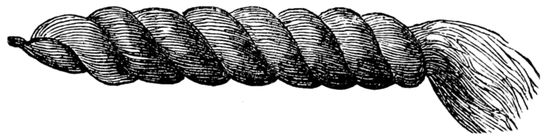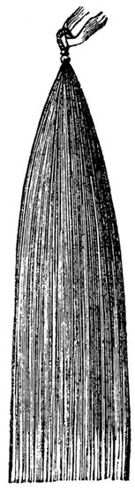 The combings are to be picked out and “carded,” being at the same time held rather loosely in the hand. By so doing, the matted hair becomes disentangled, and is deposited in or upon the “card.” It is then to be drawn out, piece by piece, and laid aside. When the whole has been “carded” in this way, it can be loosely tied in the middle, washed, and dried. I will now assume that the cleaned hair is before you, and that it is to be “turned.” Place it in the brushes; draw off a convenient portion, taking 39care that the part held in the hand is clubbed, and proceed in either of the following ways:—Hold the piece of hair in the left hand, have a cup of warm water near, into which the fingers of the right hand are to be dipped as occasion requires. The hair is to be worked between the thumb and finger, and the peculiar formation of the hair gradually forces the roots upwards. These roots may be seen plainly with an ordinary magnifying glass; they can be easily discerned by those whose eyesight is good, and are to be discovered by the touch. They generally present a whitish appearance, and are bulbous in form. It should be borne in mind that I am speaking here of the roots in a business sense only, without any regard to the more minute scientific considerations. As the roots present themselves, the hairs to which they are attached are to be pulled out and “turned,” i.e., they are to be put at the bottom of the piece of hair in hand. As each portion is done, it is to be laid aside, until the whole is completed, the roots being at one end, the points at the other. To finish the turning process, the hair should then be drawn off and tied as previously described.