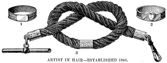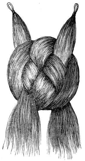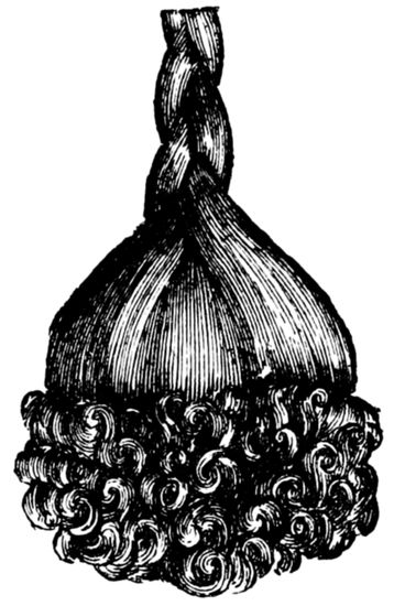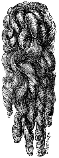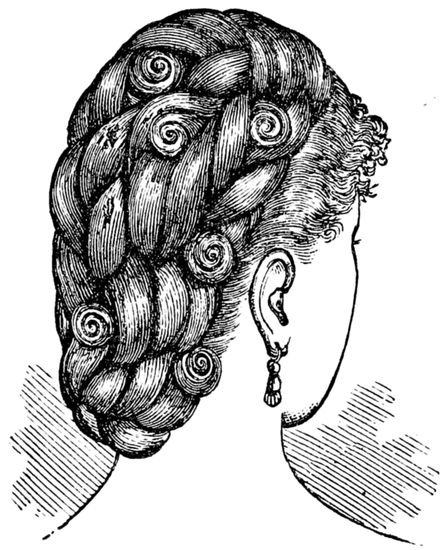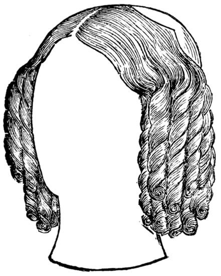 From about this time, then, “root and point” 13hair, “turned” hair, and so forth came into requisition, and English “combings” followed as a matter of course. Nowadays ladies save the “waste” hair which has been removed by the action of comb and brush, and when the mass has assumed somewhat large proportions it is taken to a hairdresser’s to be made up, and emanates therefrom in the shape of a plait, twist, &c. To show that I am not alone in regarding the use of this inferior hair with aversion, I will quote the following from the American Hairdresser and Perfumer:—