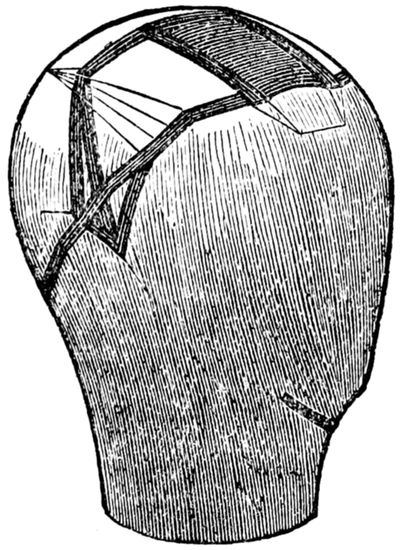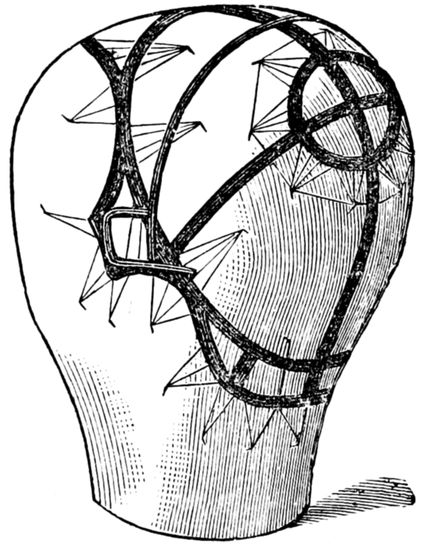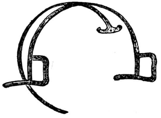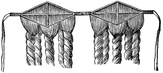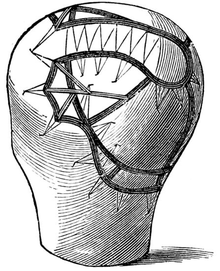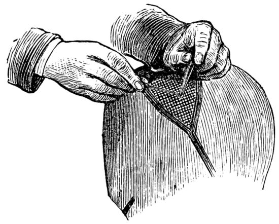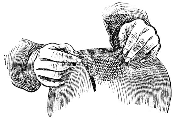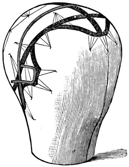 17. There are (or used to be) silk nets made for the purpose, very strong and durable, and could be procured where the “trimmings” are usually sold. The crown of this net is left rather loose and threaded on a silk cord. The cord is held up, which gathers the loose meshes together, when it should all be fastened, and thus a caul net well fitting the head is formed.