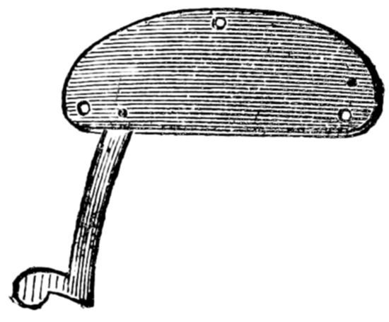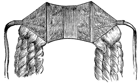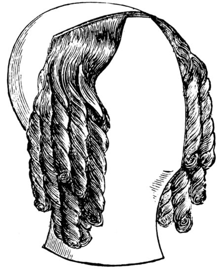 A “card” is made with a thick wooden base, into which a large number of steel prongs or spikes, about two or three inches deep, have been firmly set, and it is used for carding or smoothing hair. The possession of a pair of good drawing-brushes is also most important. They should be large and heavy, and well filled with the best bristles. These brushes are made of various sizes, but as they are so necessary and useful, I would recommend the purchase of a good article, and of fair proportions.[2] A “nitting machine” reminds 19one of a small-tooth comb, for its purpose is similar. It is made of brass, fitted with screws to be turned with the thumb and finger, and these hold together or open at will a closely-set number of steel teeth. This compact little instrument is intended to be fixed, when in use, to the front of the “card,” so that the whole length of hair may be passed through it several times. A “jigger” is wanted when piping or curling hair. It is a piece of hard wood, about seven or eight inches long, three inches wide, and half-an-inch in thickness. There are to be three holes, in the form of a triangle, towards the upper end, through which ordinary screws are passed to fix it securely to the work-table or bench. About three inches of this piece of wood or “jigger” must be allowed to project, and through the projecting part two holes are to be made in a line with each other. A piece of strong string is to be passed through these two holes, tied in a knot, and extend to within a couple of inches of the floor. The “pipes,” for curling hair, are about three-and-a-half inches in length, and the thickness of a lead pencil. Formerly they were made of earthenware clay, but common tobacco-pipe, pieces of cane, or, better still, willow, with the bark stripped off, answer every purpose. In addition to the foregoing, a dozen or more pieces of wood, about twelve or fifteen inches long and one inch square, will be required, together with vessels for boiling hair, tins or dishes for baking hair, plenty of 20string, a dressing comb or two, scissors, etc., and an old razor-blade, well-set in a handle, allowing two inches of the blade to appear, will all be useful. Soft soap, and some of the best Scotch soda, together with hot and cold water, must also be provided.
