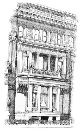 not excessive string courses which traverse it and mark the division of the stories. It is questionable whether this massiveness is not carried too far, but everybody will admit that an excessive weight of wall is a “good fault” in the street architecture of New York, and that of the two, a dwelling is more dignified which approaches the solidity proper to a prison than one that emulates the precarious lightness proper to a greenhouse. The depth of the porch and of the recessed balcony over it in the central division of the avenue front assists this expression of solidity, and helps the building to wear its burden of decoration “lightly, like a flower.” The richness, as we have said, is almost unexampled in New York. Of strictly architectural decoration—that is, of members and details which are usually designed by the architect of a building—there is a copiousness which is only saved by the means just indicated from becoming an embarrassment of riches. All this work is exquisite in execution. In design it is generally interesting and scholarly, though there is common to all of it the defect of being too small to be thoroughly well seen and thoroughly effective. The uniformity of this defect of scale seems to prove that the architect erred in estimating the effect of his design in the colorless material employed. The decoration of the recess of the balcony, too, loses effect by being entirely unrelated to the construction, and the stone trellis with which the turret at the angle is overlaid is equally irrelevant to the object to which it is applied. Architectural decoration ceases to be such when it ceases to be a development of the structure; and these exceptions, by their comparative ineffectiveness, confirm the wisdom of the rule by which elsewhere throughout the building the ornament is used to emphasize the structure, and thereby gains greatly in impressiveness and in charm.{56}