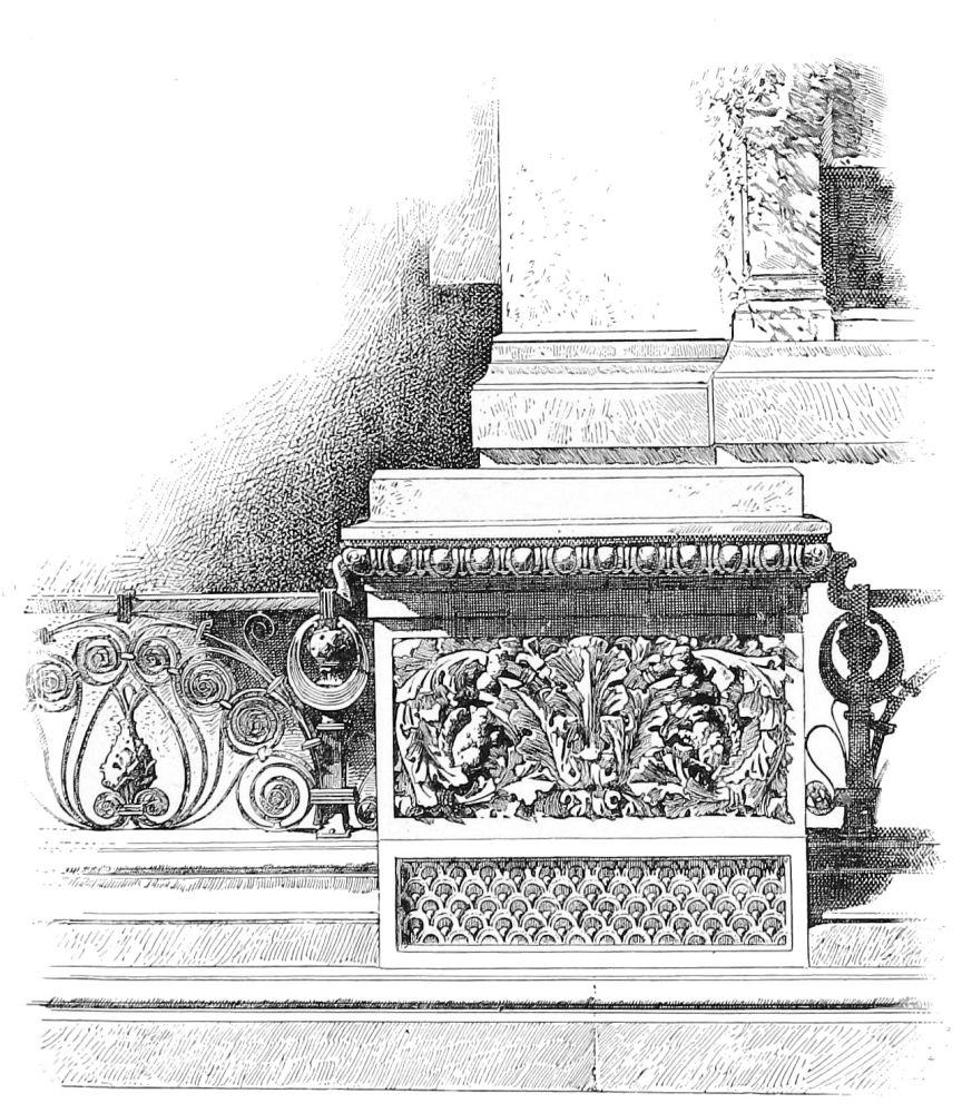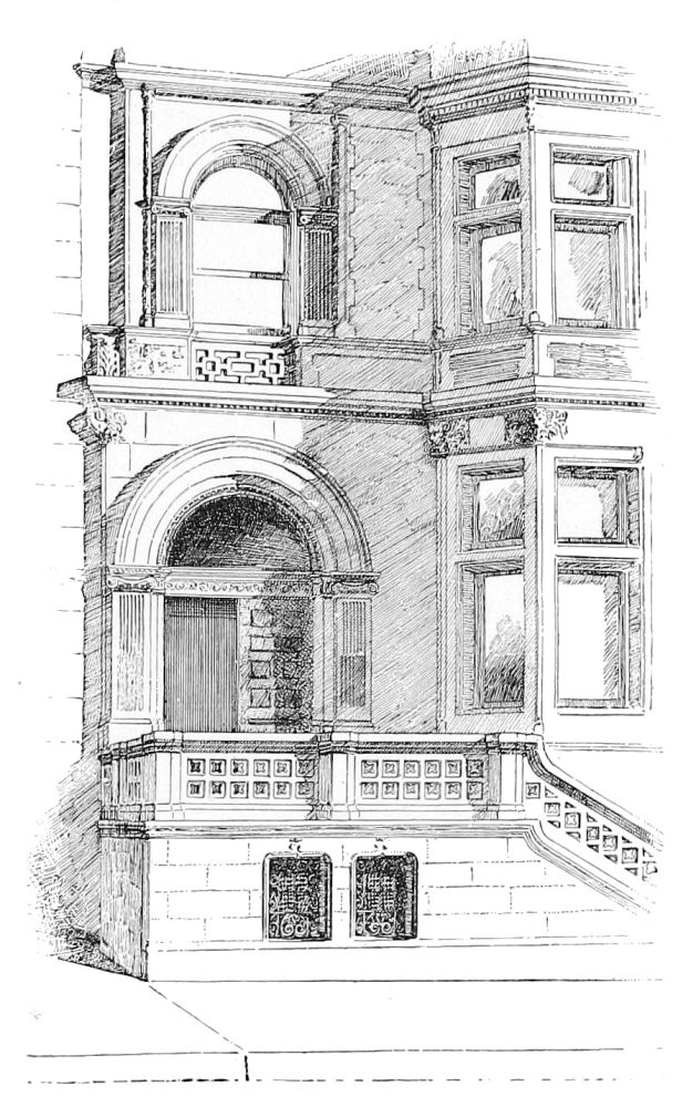 Between either of these and the brown-stone houses which have been built for Mr. William H. Vanderbilt, after the designs of Messrs. Herter, the decorators, a wide architectural gulf is fixed. We found a leading motive in each of the others; but what leading motive, or, indeed, what subordinate motive, of an architectural kind, can be found here? There is indeed no development of lines or of masses, and no organized relation of parts is aimed at. The openings are not grouped or spaced so as to tell the story of the interior, nor so as to bear any reference to each other, nor are the structural features which every building must possess brought out by modelling; nor is the ornament applied{66} to accentuate the structural features, nor is it designed with reference either to its place or to its function as ornament. The fluted pilasters of the second story seem to be meant, indeed, to re-enforce the angles of the projecting portions of the wall. But this intention is abandoned in the first and in the third stories, in which a belt of carved foliage is run to the angles of the wall, without reference to the lines of the pilasters. This foliage is in workmanship as careful as possible—as careful, indeed, as the carving in either of the architectural works which we have been discussing. Yet its perfection gives no pleasure to the spectator, for the simple reason that it has nothing to do with the building in the walls of which it is cut. Much of the detail is carefully designed, but the absence of a general design makes it ineffective. Except for the refinement of some of this detail, the building would be as vacant of architectural interest as any work of our architectural period of darkness. The Stewart mansion does not interest students of architecture; but the Stewart mansion itself exhibits a nearer approach than these houses to an architectural design, and certainly a coherent design with coarse detail is less depressing, even if it be more irritating, than an entire absence of architectural meaning, with here and there a pretty architectural phrase which in some other context may have meant something. These houses have another misfortune in their very lugubrious color. A vivid piece of painted decoration in the recessed balcony of the nearer is a grateful oasis in the gloomy waste of rubbed sandstone, and some relief to its monotony is also afforded by the gilded railings of the windows at each side of this balcony. But it is to be hoped that courage may be found to let loose a discreet decorator with unlimited goldleaf upon the whole sad fronts. A mode of decoration{67} which has been found so effective in the fogs of London might profitably be employed to animate façades which are in no danger of becoming too joyous. It would not be fair to leave these architectural failures, which are in so unpleasant contrast to the encouraging architectural success achieved in the other Vanderbilt houses, without noting one excellent piece of design in the railings which surround them, in which an original, characteristic, and successful treatment of metal has been attained, and which, as works of art, are really of more value than the houses they protect.