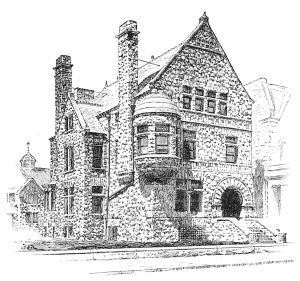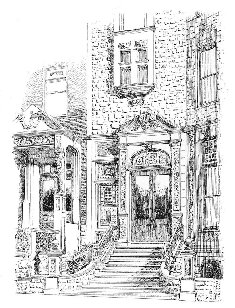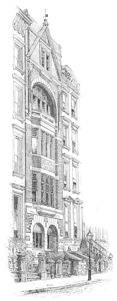 Thus far we have been speaking of the respectable and conservative element in the new departure, of the Extreme Right, so to speak, and generally of works which were seriously designed, and so are entitled to be seriously considered. It is not so pleasant to turn to the Extreme Left, a frantic and vociferous mob, who welcome the “new departure” as the disestablishment of all standards, whether of authority or of reason, and as an emancipation from all restraints, even those of public decency, and who avail themselves of the remission of them from academic restraints to those imposed by their own sense of propriety by promptly showing that they haven’t any. The tame decorum of one phase of the new departure is supplemented by the violent indecorum of another. Sometimes the same designers march now with one wing and now with the other of the divergent host. Messrs. McKim, Mead, & White, for example, have consoled themselves for what now almost seems to have been the enforced sedateness of the houses we have noticed, by a mad orgy of bad architecture in East Fifty-fifth Street. The scene of this excess almost immediately adjoins the dignified and respectable dwelling designed by Mr. Haight, and almost frights that edifice from its propriety, and the designers seem to have been led into it by the baleful example of older persons who ought to have known better, and who committed the maddest freaks in the artistic quarter of the London suburb of Chelsea while in a condition of total irresponsibility alike to any con{32}victions and to any conventions of architectural art. The present indecorum has been committed in the design of two dwellings which consist of a ferociously rugged basement and parapeted cornice in granite, with two or three irregularly disposed tin dormers emerging above, and with a flat and shallow screen of brick wall inserted between them, as between the upper and the nether millstone, and having its thinness emphasized at all the angles by shallow incisions forming a series of brick weather-strips, as it were, a square reticulation of which traverses the plane surfaces also. It is quite conceivable that rugged simplicity may have suggested itself to a designer as a desirable character for a city house, but it seems scarcely possible that squareness and flatness and thinness should have appeared desirable, and quite impossible that beauty should have seemed to dwell in a building the top and bottom of which were characterized by rugged simplicity, and the middle by squareness and flatness and thinness. The details, whether in brick or granite or tin, are as preposterous as the conception of a building with its parts thus swearing at each other. The round-headed doorway is surmounted with the imitation in granite of a metal flap secured to the rest of the block from which it is cut by similitudes in granite of iron bolt-heads. In the basement respectable blocks of granite are subjected to the indignity of being decorated with streaming ribbons in low-relief. In truth, the only detail of the work which one can contemplate even with tolerance is a grill in the basement doorway which is the simplest possible trellis of iron rods.