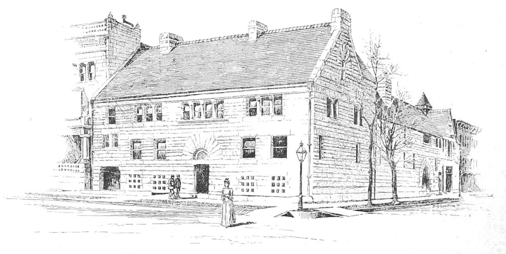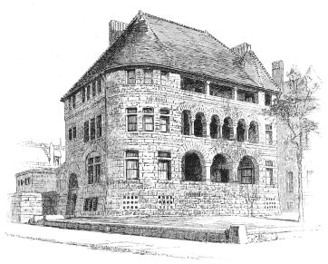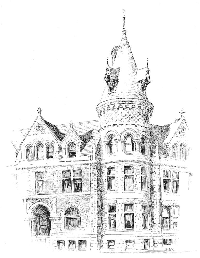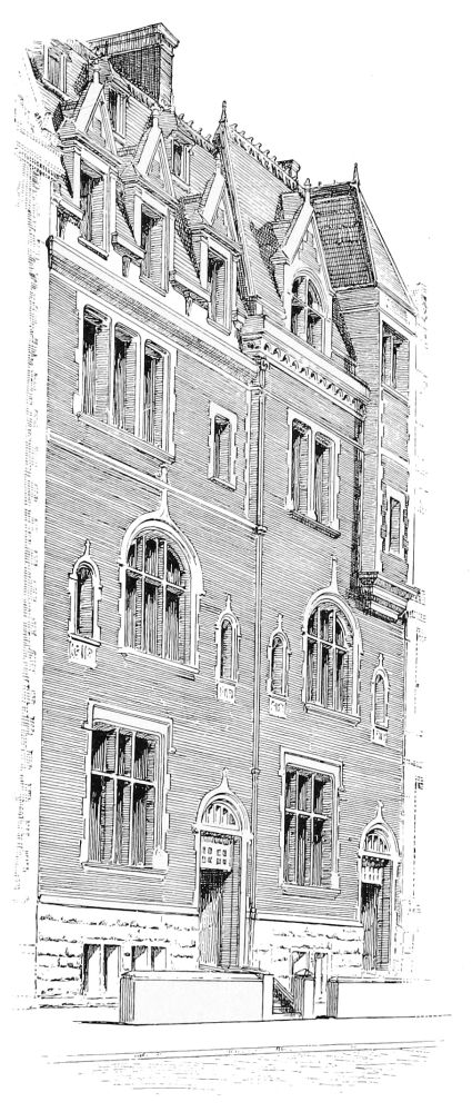 The buildings in which these solecisms appear, we repeat, are the successes of Queen Anne. For structures more complicated most of its practitioners have shrunk from invoking it. Messrs. Peabody and Stearns, indeed, took the ground, when they designed the Union League Club House, that a “feature” supplied a sufficient idea for that edifice; and that a portico of four large Roman Corinthian columns in front, subdued to an equal number of brick pilasters on the side, would meet the architectural requirements of the case, if they let their consciousness play freely over the remaining surfaces without reference to this central thought. But the result has scarcely justified this belief, and the spectator finds that the building, in spite of the unifying influence of a large and simple roof, in addition to the feature in question, does not make a total impression, but is scattering and confused; while its parts, taken singly, are feeble in spite of their extravagant scale. This, indeed, is not even a sacrifice to the conventions, but a specimen of what can be achieved in a style of gentle dulness gone rampant. If tame Queen Anne is a somewhat ineffectual thing, what shall be said of wild Queen Anne? There is nothing wild about two other public buildings in which architects have ventured upon Queen Anne—one a hospital, in Park Avenue, by Mr. Haight, and one an “institution” of some other kind, in Lexington Avenue, by Mr. Fernbach. Both of these, indeed, are tame, and whatever the differences of detail may be, both have much the same expression, so that one carries away from either, as from one of the commonplace faces which we are always confounding, an impression which may{28} be that of the other—in either case of a centre with projecting wings separately roofed, and the whole wall overlaid with a shallow trellis of brick-work, too shallow to be serviceable as buttresses, and serviceable only as the badge of the alleged “style.” It seems hard upon an owner that he should be required to pay money for rectangular applications of brick which can scarcely strengthen his building appreciably, and can hardly be held to beautify it, by way merely of labelling it, “This is Queen Anne.” And this resemblance, be it noted, which is not so much a specific resemblance as the expression of an amiable characterlessness common to both, is not all to be imputed to the architects, except upon the ground of their choice of a style. The works of both of them have character, and not at all the same character, when they are working in a style which is a real form-language in which meanings can be expressed, and not a mere little phrase-book containing elegant extracts wherewith to garnish aimless discourse. Mr. Fernbach,[C] as is testified by such works as the “Staats-Zeitung” building and the German Savings-Bank in New York, and the building of the Mutual Insurance Company in Philadelphia, is one of the most accomplished practitioners in this country of academic Renaissance. Mr. Haight, as we shall presently see more at large, is a highly accomplished designer in Gothic. It is not their fault if Queen Anne, when spread over an extensive façade, spreads thin.