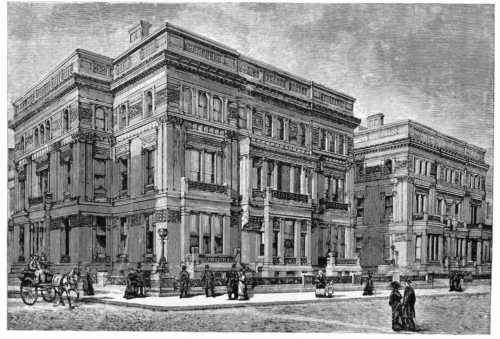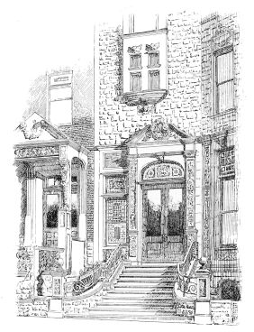 Another interesting piece of Gothic work, though this time of distinctly Victorian Gothic, is the house designed by Mr. Vaux for Governor Tilden. The interest of this, however, is rather in the detail of form and color than in general composition, since the building is architecturally only a street front, and since the slightness of the projections and the lack of visible and emphasized depth in the wall itself give it the appearance rather of a screen than of one face of a building, and the small gables which surmount it too evidently exist for the sole purpose of animating the sky-line. But the color treatment of this front is admirable, and recalls the best work of the most successful colorist in architecture whom we have ever had in New York—Mr. Wrey Mould. It is characteristic that interesting treatment of color, like every other properly architectural development, has been stopped short by the new “movement.” An unusually large variety of colors, and those of the most positive tints that natural stones supply, has here been employed and harmonized; and, what is even rarer, they have all been used with architectural propriety to accentuate the construction and to heighten its effect. An ingenious and novel use of dark granite, which when polished is almost black, and which is employed in narrow bands precisely where it is wanted, deserves particular remark. The decorative carving attracts attention chiefly by its profusion, and by the exquisite crispness and delicacy of its execution. In both these respects the only parallel to it is in the house of Mr. W. K. Vanderbilt, for, as we have seen, the carving upon the houses of Mr. W. H. Vanderbilt does not count. That this carving counts so fully is the result of the skill of the architect in fixing its place and adjusting its scale so that it everywhere assists the architecture, and is better in its place than it would be in another place.{42}