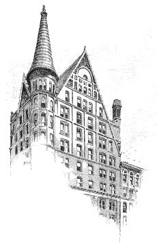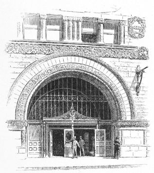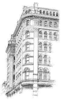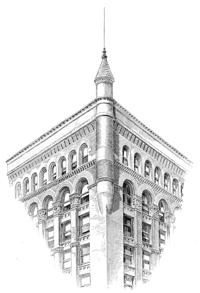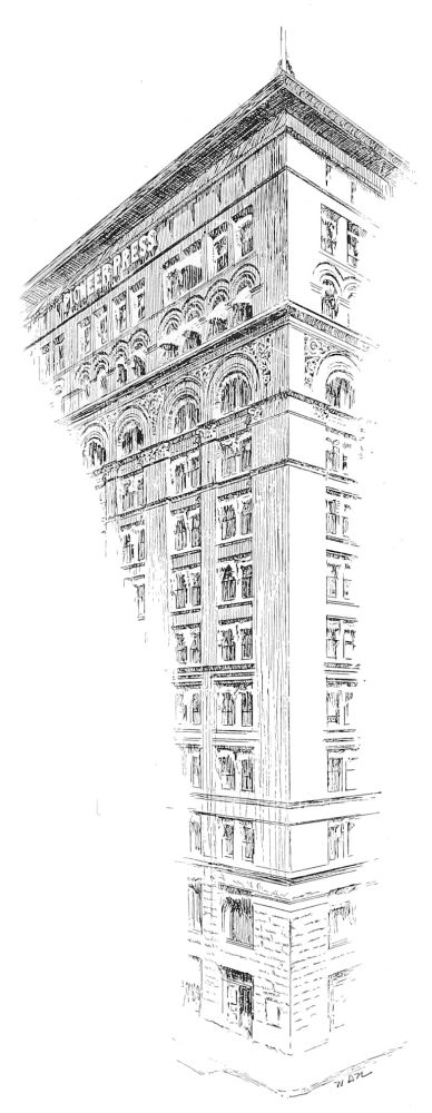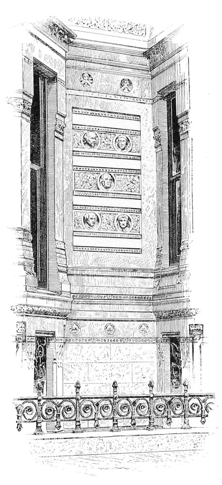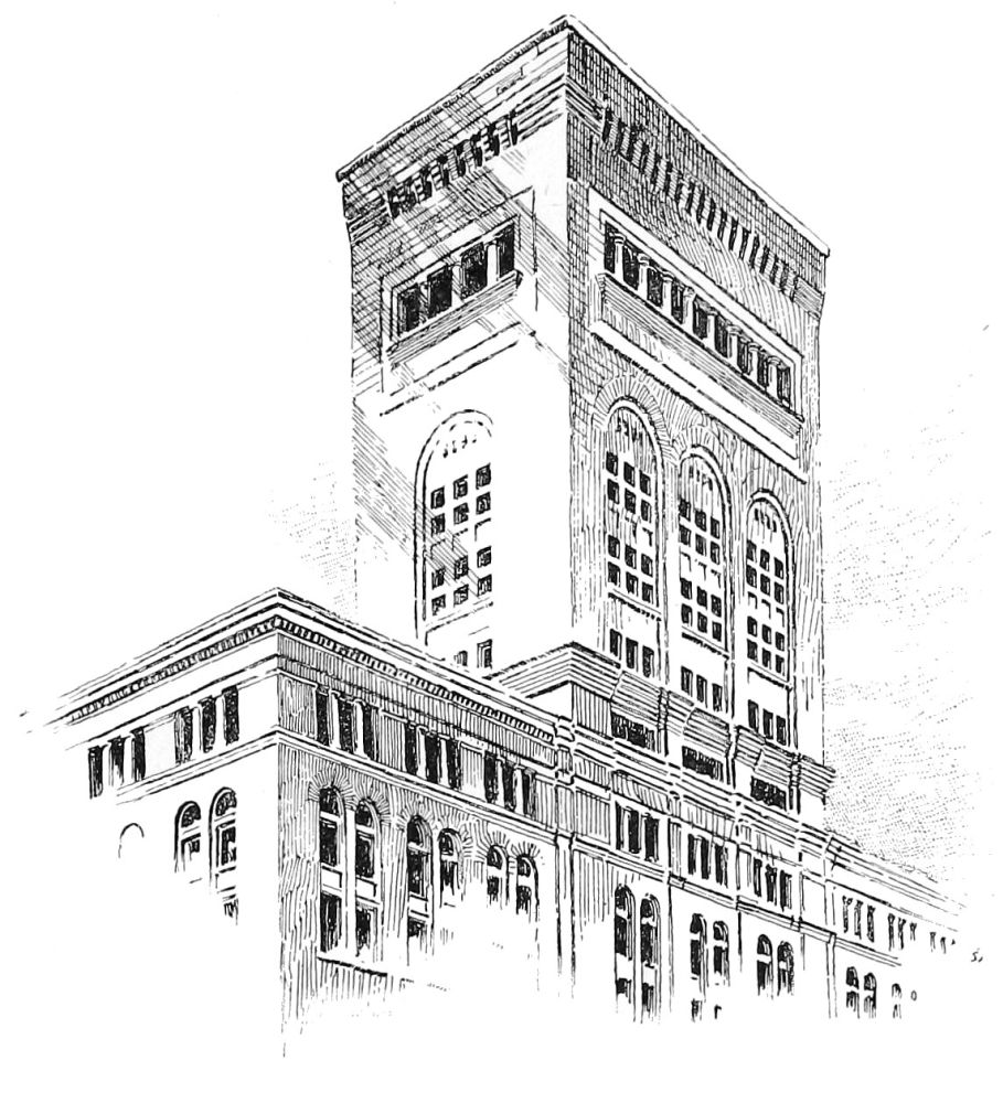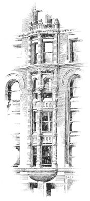 the brick-work counting in with the two-story substructure of masonry, carrying a superstructure of seven, crowned with an attic of two. This latter feature proceeds, doubtless, from the special requirement of a newspaper office superposed upon a business block, and it may be inferred that to this requirement is due the greater enrichment of the lower of the two attic stories, contrary to the usual arrangement, and testifying the architect’s belief, mistaken or not, that the editorial function is of more dignity and worthier of celebration than the typographical. At any rate, the unusual disposition is architecturally fortunate, since it provides, in the absolutely plain openings of what is presumably the composing-room, a grateful interval between the comparative richness of the arcades beneath and of the cornice above. In the main front, the ample entrance at the centre supplies a visible motive for the vertical as well as for the subordinate lateral division. It is developed through the three stories of the basement, and it is recognised in a prolongation upward of its flanking piers through the central division—which{194} is completed by round arches, the spandrels of which are decorated—and through the attic, so as to effect a triple division for the front. The unostentatious devices are highly effective by which the monotony that would result from an identical treatment of the seven central stories is relieved, while the impression made by the magnitude of such a mass is retained. The terminal piers are left entirely unbroken throughout all their extent, except for a continuous string course above the eighth story, which might better have been omitted, since it cuts the intermediate piers very awkwardly, and detracts from the value of the heavier string course only one story higher that has an evident reason of being, as the springing course of the arcade; while the intermediate piers are crossed by string courses above the fifth and the ninth stories, so as to give to the central and dominant feature of the main composition a triple division of its own into a beginning, a middle, and an end.