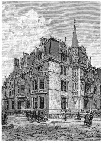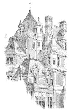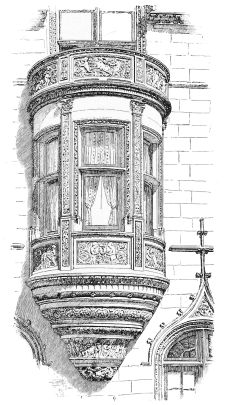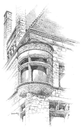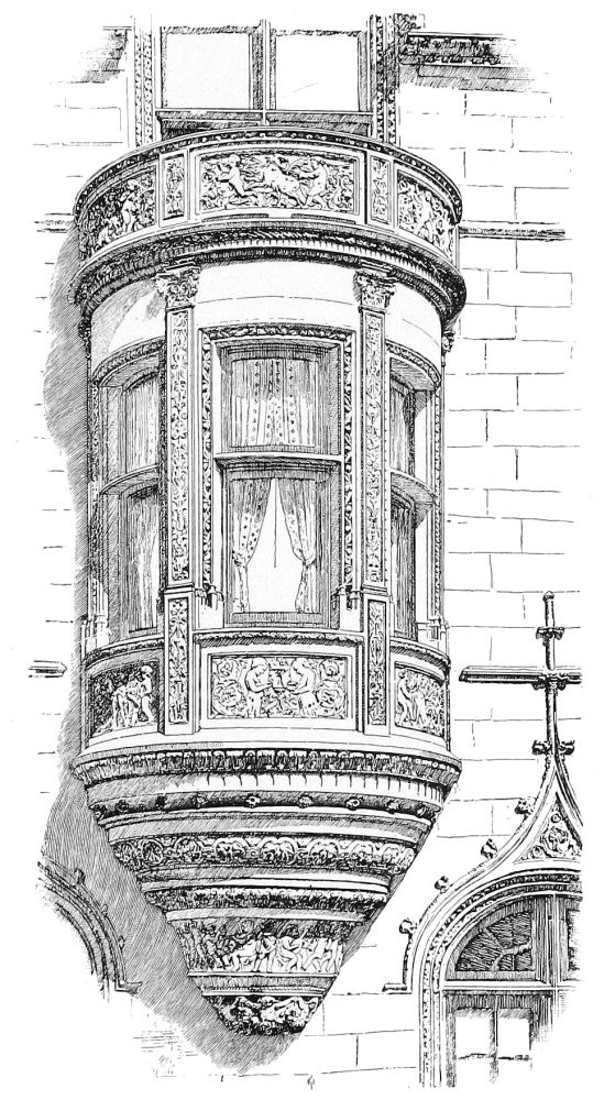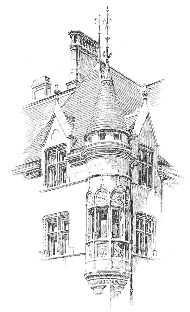 One’s admiration of Mr. Hunt’s spirited and scholarly design does not indeed cease with the walls of the house; but it must be owned that it undergoes some modification above the cornice. It cannot be said that the sky-line is so effective as might have been expected from what is beneath it. There is an undeniable piquancy{57} about the statued gable which terminates the roof of the principal mass, and the relation between this roof and the steep hood of the turret is picturesque, taken alone. Unfortunately, it cannot be taken alone, and the effect of the whole series of roofs is not a harmonious grouping, but—there is no other word for it—a “huddle.” It is in the roof, too, that the shortcomings of the architect in the solution of what may be called his academic problem are most apparent. The style of his work is the transitional style of France, the modification of mediæval architecture under the influence of the Italian Renaissance, until what was all Gothic at the beginning of the transition had become all classic at its close. This is, in fact, an attempt to summarize in one building the history of a most active and fruitful century in the history of architecture, which included the late Gothic of the fifteenth century and the early Renaissance of the sixteenth, and spanned the distance from the minute and complicated modelling of the Palais de Justice at Rouen and the Hôtel Cluny at Paris, to the romantic classicism of the great châteaux of the Loire. Certainly the attempt does not lack boldness. Here we have in one building the superimposed bases and interpenetrating mouldings of the latest French Gothic and the fish-bladder tracery of the Renaissance, and in the dormers the stride from the ogee canopies of Rouen to the prim pilasters and pediment of Orleans. Mr. Hunt’s skill has not sufficed to introduce together these features, the outcomes of different modes of thought as well as of different systems of construction, without a visible incongruity; nor are they in all cases successful, taken singly. The large and elaborate dormer over the entrance, especially, instead of being a visible reconciliation of the two styles, is a visible demonstration that they cannot be recon{58}ciled. A complete construction of post and lintel, of pilaster and entablature, is supplemented by another construction of flying buttresses which are clearly superfluous and irrelevant, and which, instead of resisting the thrust of an arch, have the appearance of ineffectually “shoring up” a structure which, though complete, is unstable.