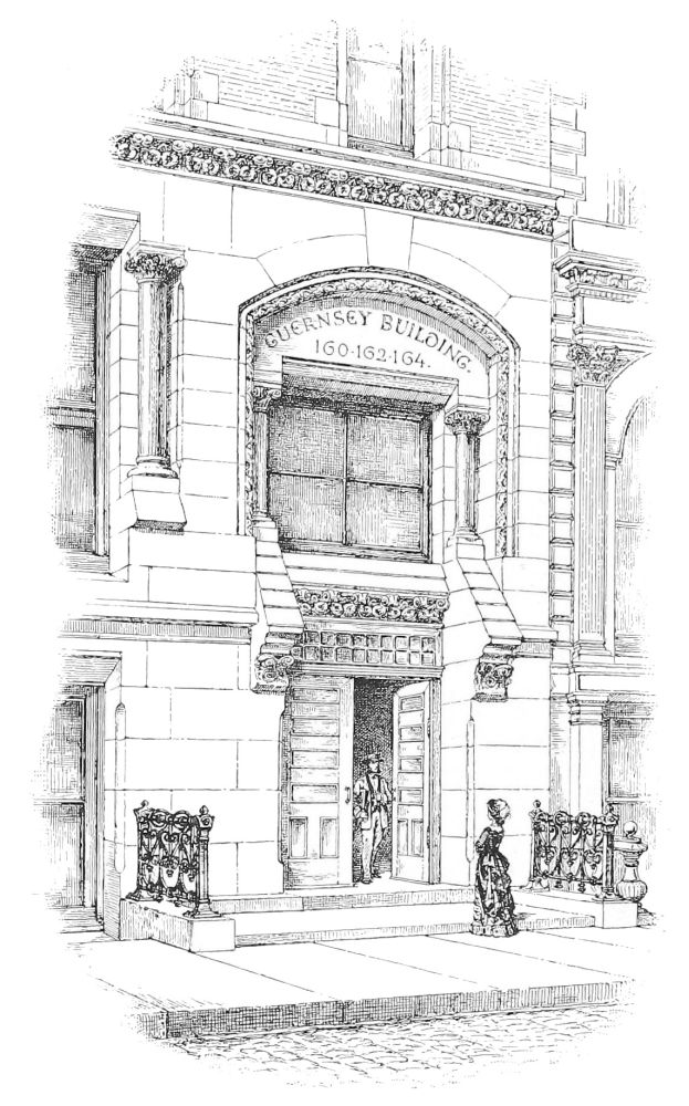 These things are equally true of the equally profuse carving in the house designed by Mr. Hunt for Mr. W. K. Vanderbilt; but this, although in a monochrome of gray limestone, would have a high architectural interest without the least decoration by force of design alone. The decorative detail is scarcely so well adjusted to the building in scale as that in the house just mentioned, or in the house designed for Mr. Cornelius Vanderbilt by Mr. Post, being partly lost by its minute{43}ness, but it has the same merit of being in the right place, and designed for its place, and is cut with the same perfection. In a more recent work of Mr. Hunt’s, the Guernsey Building, in lower Broadway—a street front in distinctly modern Gothic—there is assuredly no error in scale on the side of minuteness; but the treatment, in mass and in detail, is marked by great vigor and animation, and the architecture of the building is an emphatic expression of its structure.