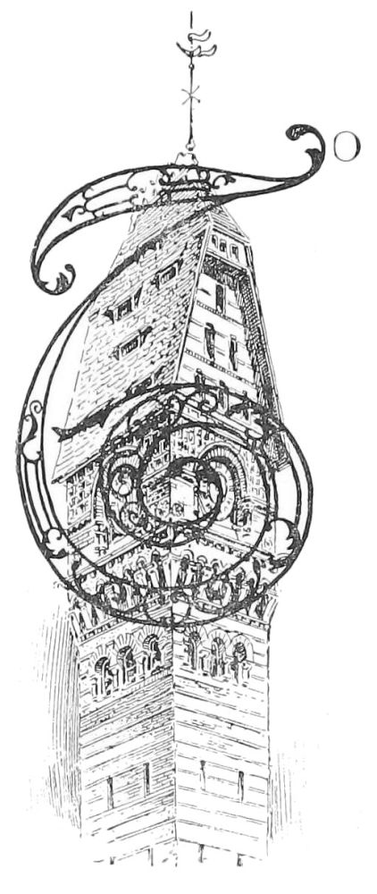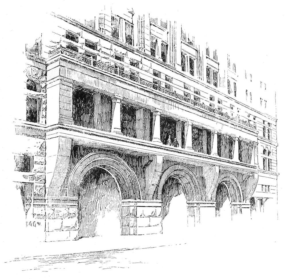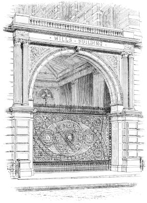 It is strange to see so thoroughly studied a performance as this succeeded by so thoroughly unstudied a performance as the Mills Building, by the same architect. But possibly ten-story buildings, which must be built in a year, will not wait for architects to mature designs which would make the buildings of interest to students of architecture as well as to investors. Whatever the cause may be, the result is unfortunate; for after the grandiose and somewhat swaggering Roman gateway, and the portcullis which it encloses, have been taken out, the rest of the Mills Building may safely be thrown away. The portcullis is really an interesting piece of iron-work both in design and in workmanship, although in both it is distinctly inferior to such a piece of work as the nondescript beast in cast iron that performs the humble office of holding a sign in Cedar Street, and that might have been wrought in the thirteenth century, so grotesque, so skilful, so charged{49} with the spirit of artistic and enjoyed handicraft it is. [See initial letter.]