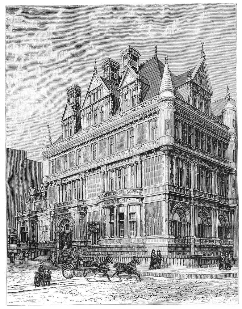 One is inclined to ascribe the lack of unity and repose which the disturbed sky-line of the building entails upon it, and which somewhat impairs the dignity of an otherwise dignified and always animated design, to the angle turret of which the architect was evidently enamoured. We may share his liking for it, and admit it to be an extremely pretty thing, without admitting that it belongs to this building. The leading motive of the composition is evidently the “pyramidization,” to borrow Mr. Thomas Hope’s uncouth word, of the whole building towards the apex of the main mass at the angle, from the point of view from which the illustration is taken. It is clearly to assist and emphasize the ascent and convergence of all the lines of the building to this apex, and to enhance the apparent dimensions, that this mass is raised a story, and the extremities of the building allowed to fall away, and it is in order to account for the emphasizing of this mass by a separate roof that the somewhat awkward expedient has been adopted of dropping the cornice on the street side below the eaves. New York readers who are familiar with the aspect of the Dry Dock Savings-Bank in the Bowery will know what is meant by this “pyramidization,” and will remember how it is there attained. Now it happens that it is precisely this intention which in the present instance is obscured and partly defeated by the tormenting of the sky-line, which in turn may be traced to the insistence of the architect upon his extremely pretty but irrele{59}vant