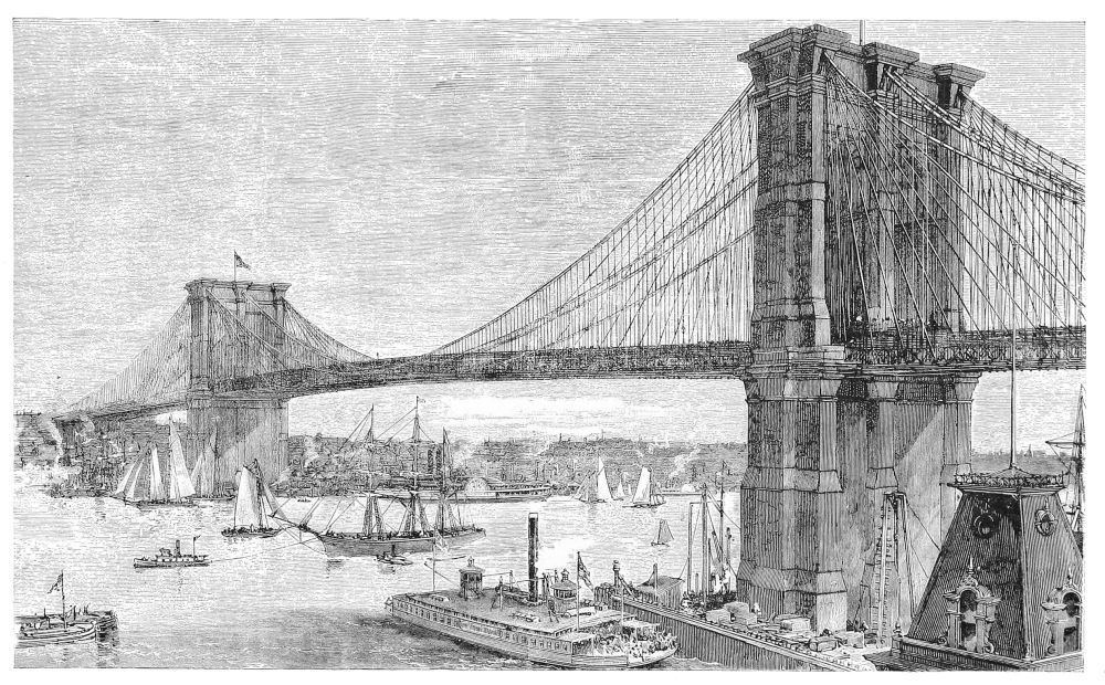Reduced to its simplest expression, and as it has actually been used for unknown periods in Asia and in South America, a suspension-bridge consists of two parallel ropes swung from side to side of a ravine, and carrying the platform over which the passenger walks. As the span increases, so that the dip makes the ropes impracticable, the land ends of the ropes are hoisted some distance above the roadway which they carry. If nothing can be found there strong enough to hold them, they are simply passed over, say, forked trees, and the ends made fast to other trees or held down with stones. This is the essential construction of the Brooklyn Bridge. The ropes become four cables sixteen inches thick, of 5541 steel wires; the forked tree becomes a tower 276 feet high, and 8260 square feet in area at the base; the bowlder to hold down the end of the rope becomes a mass of masonry of 60,000 tons’ weight; the shaky platform becomes a great street, 85 feet wide, of five firm roadways. But the man who first carried his rope over the forked tree was the inventor of the arrangement which, developed through all the refinements of modern mechanics, forms the groundwork of the Brooklyn Bridge.