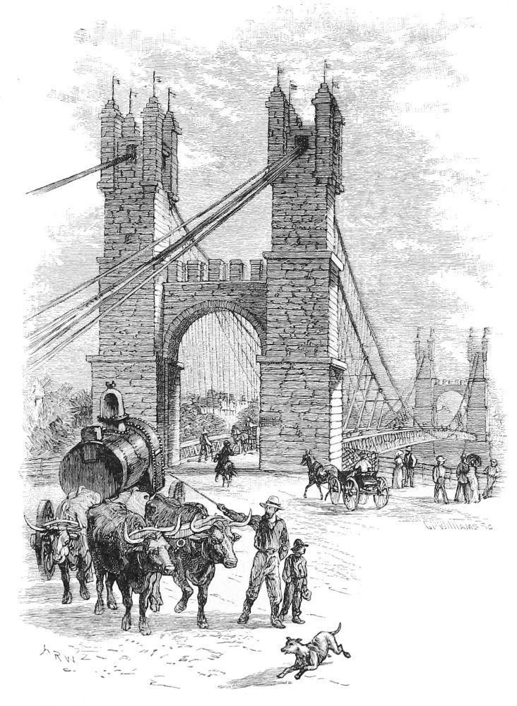 THE total length of the bridge is 5989 feet, of which the central span between the towers is 1595 feet 6 inches, the “land spans” from the towers to the anchorages each 930 feet, the approach on the New York side 1562 feet 6 inches, and on the steeper Brooklyn side 971 feet. These dimensions do not make this the longest bridge in the world. But when it was built there was no single span which approached the central span over the East River; and though it has since been exceeded by two spans of the Forth Bridge, in Scotland (1710 feet each, sustained by cantilevers), it remains by far the largest example of a chain-bridge. It is half as long again as Roebling’s Cincinnati Bridge (1057 feet between towers), and nearly twice as long as the same engineer’s Niagara Bridge (821 feet). The span of the ill-fated bridge over the Ohio at Wheeling, which was built in 1848, and blown down in 1854, was 1010 feet. Noteworthy suspension-bridges in Europe are Telford’s, over the Menai Straits (589 feet), finished in 1825; Chaley’s bridge, at Fribourg (870 feet), finished in 1834; and Tierney Clark’s bridge over the Danube at Pesth (670 feet), finished in 1849. The longest spans bridged otherwise than by a roadway hung from cables are the central spans of Stephenson’s Britannia (box girder) Bridge (459 feet), of Eads’s St. Louis Bridge, of steel arches (520 feet), and of the beautiful Washington Bridge, of steel{69}