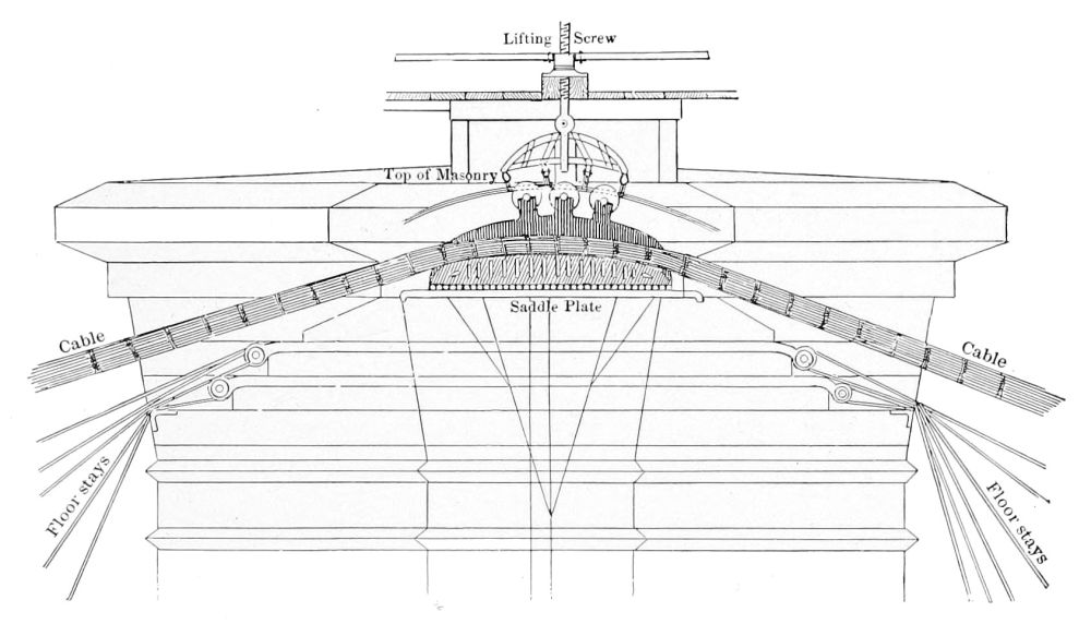 The flatness of the top alone conceals instead of expressing the structure. It is of the first practical necessity that the great cables should move freely in their saddles, so as always to keep the pressure upon the piers directly vertical, and very ingenious appliances have been employed to attain this end, and to avoid chafing the cables. But the design of the piers themselves{77}
