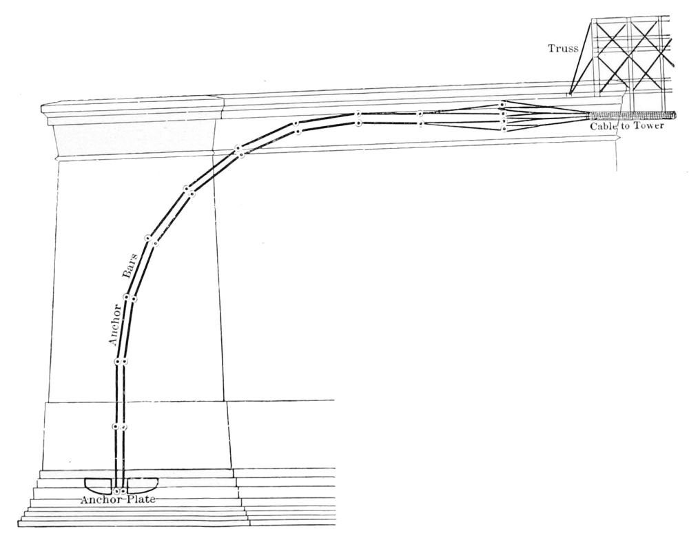 What we have said of the towers is true also of the anchorages. The bowlder which the Peruvian rolls upon the end of his rope to hold it down is here a mass of 60,000 tons. Scientifically it is adjusted to its purpose, no doubt, with the most exact nicety. Artistically it is still but a bowlder rolled upon a rope. It would probably be impracticable to exhibit the anchor plate which takes the ultimate strain of this mile and more of cable, though we may be sure that our Greek or our Gothic bridge-builder would not have admitted its impracticability without as exhaustive an investigation as the modern bridge-builder has given to the mechanical aspects of his problem. But it was certainly practicable to indicate the function of the anchorage itself, to build it up in masses which should seem to hold the cable to the earth, or a double arch like—or rather unlike—the double arch of the main tower, turned between piers which should visibly answer the same purpose. Instead of either of these, or of any technical device for the same purpose, the weight above is a crude mass, so far from being adapted to its function in its form, that one has to look with some care to find it from the street below, and to distinguish it from the approaches.