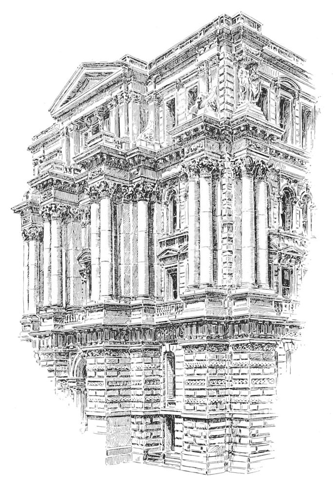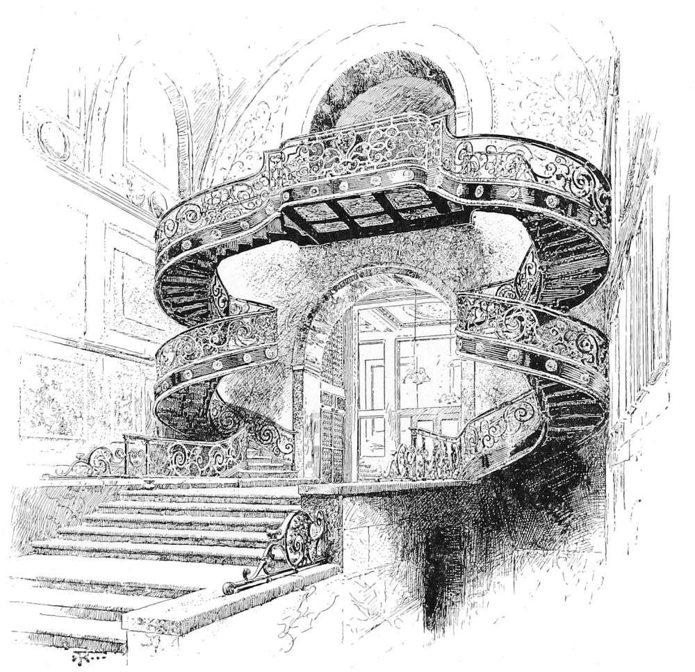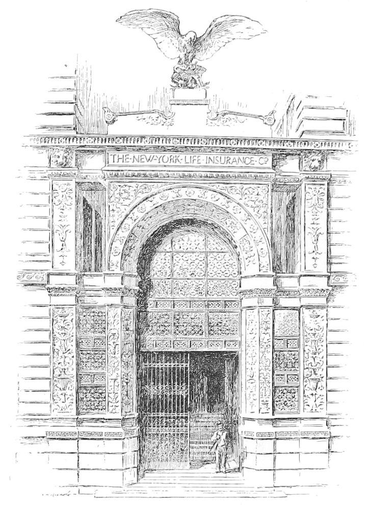 being of brick-work. The two principal divisions are too nearly equal; nor does the change of material effected by building the two upper stories of the basement in brick-work achieve the rhythmic relation for the attainment of which it was doubtless introduced. But the structure is nevertheless a more satisfactory example of commercial architecture than the St. Paul building. Its entrance, of four fluted and banded columns of a very free Roman Doric, with the platform on consoles above, has strength and dignity, and is a feature that can evidently be freely exposed to the weather, and that is not incongruous as the portal of a great commercial building. A very noteworthy feature of the interior is the double spiral staircase in{201} metal that has apparently been inspired by the famous rood screen of St. Étienne du Mont in Paris, and that is a very taking and successful design, in which the treatment of the material is ingenious and characteristic.