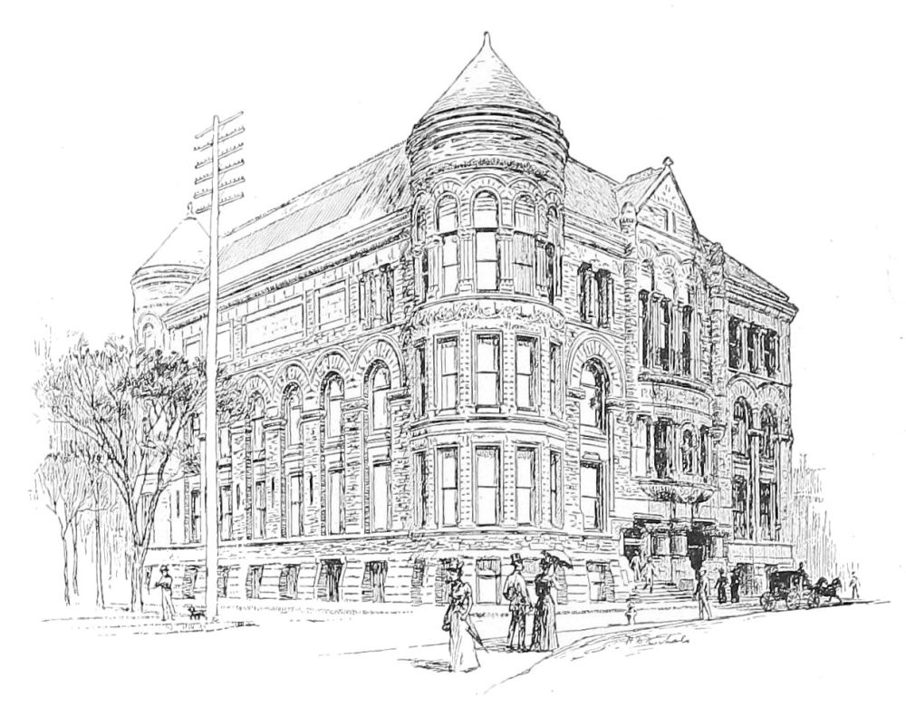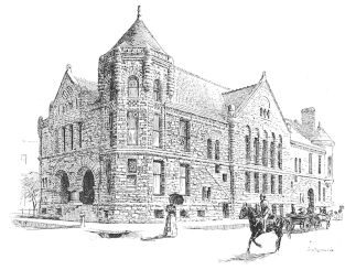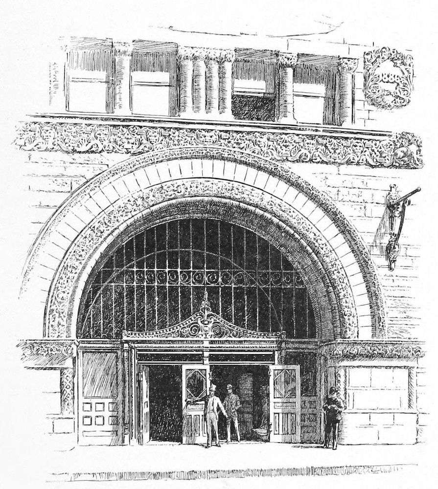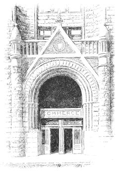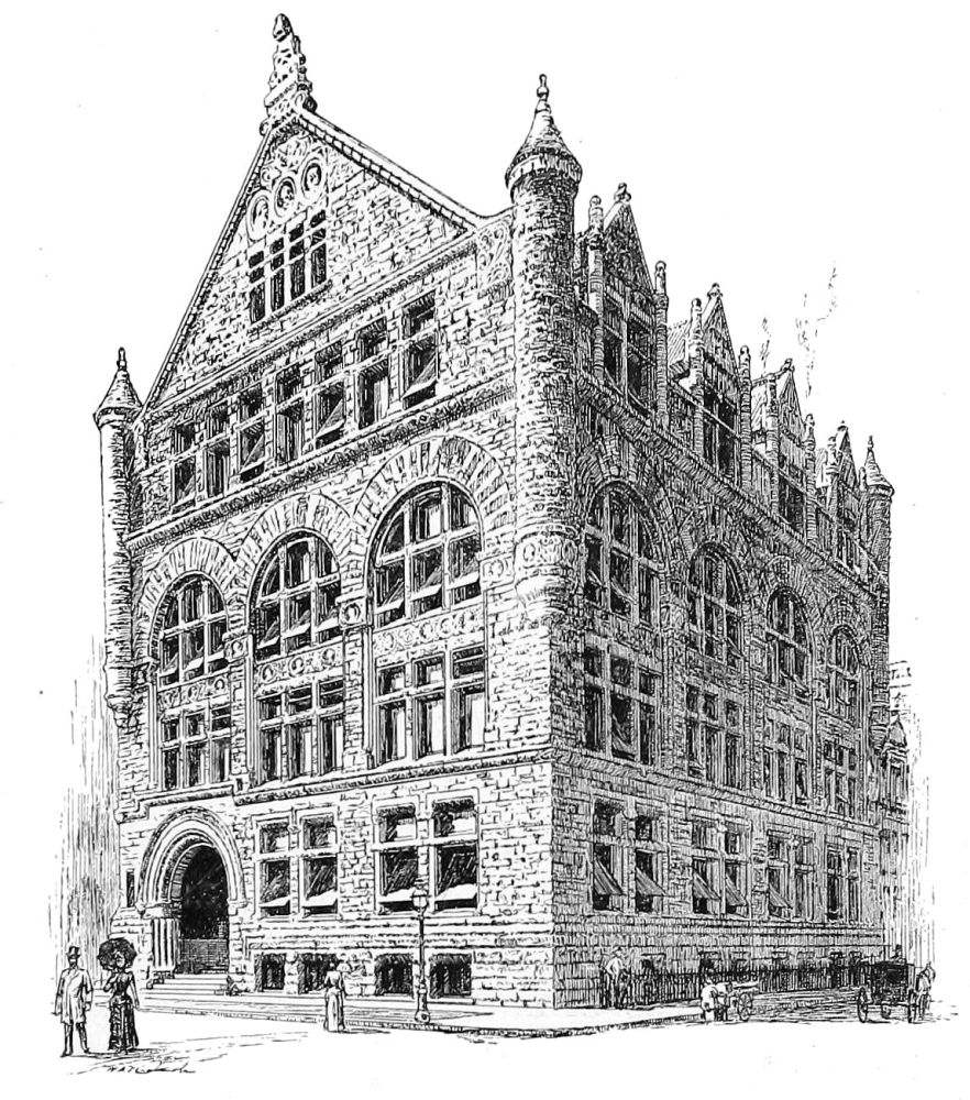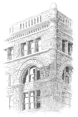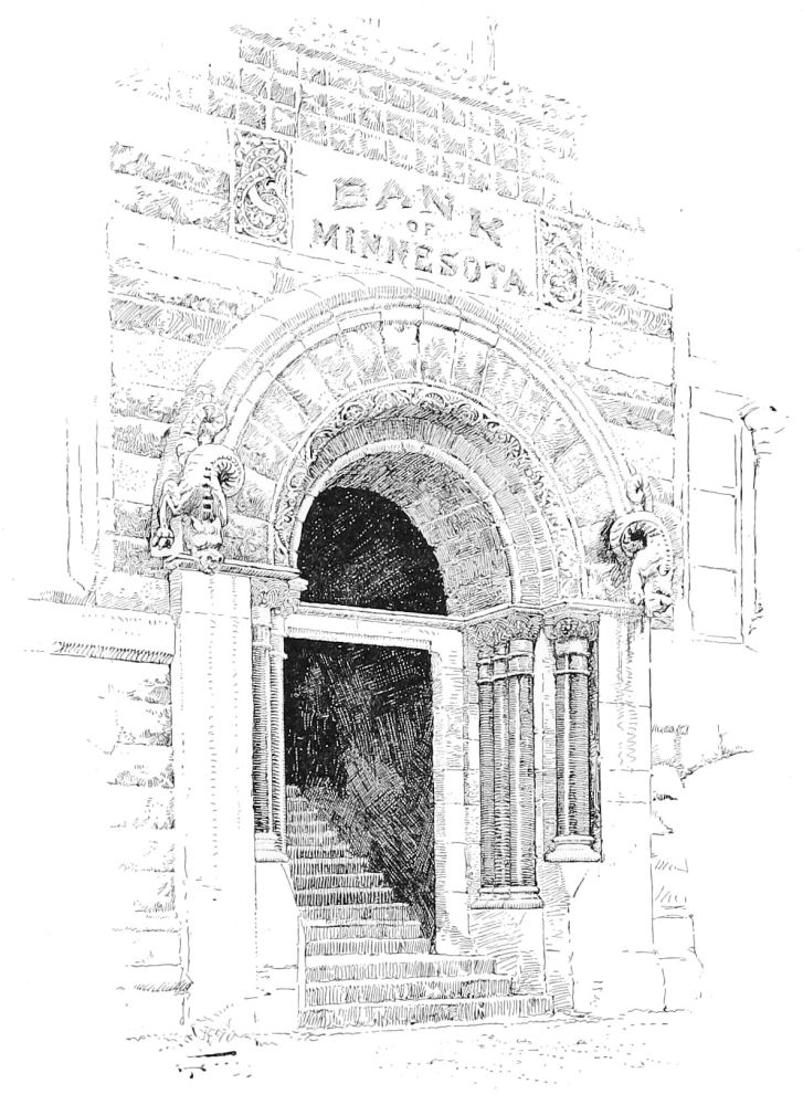 The building is very successful, and the more successful because the designer has shirked nothing and blinked nothing, but out of this nettle, commercial demands, has plucked this flower, commercial architecture. The same praise of an entire relevancy to its purpose belongs to the Bank of Minnesota, a well-proportioned and well-divided piece of masonry, in spite of more effort at variety in outline, and of somewhat more of fantasy in detail. The former is manifested in the treatment of the roof, in which the gables of the upper story are relieved against a low mansard; and the latter in the design of these gables and of the rich and effective entrance. The problem, as one of composition, is very much simplified here, since the building is but of six stories, and the dilemma of monotony or miscellany, which so awfully confronts the designers of ten and{195} twelve story buildings, does not present itself. The two lower stories, though quite differently detailed, are here grouped into an architectural basement, the grouping being emphasized in the main front by the extension of the entrance through both. The superstructure is of three stories, quite identical and very plain in treatment, and above is the lighter and more open fenestration of the gabled attic.