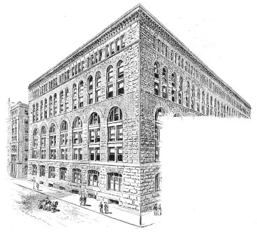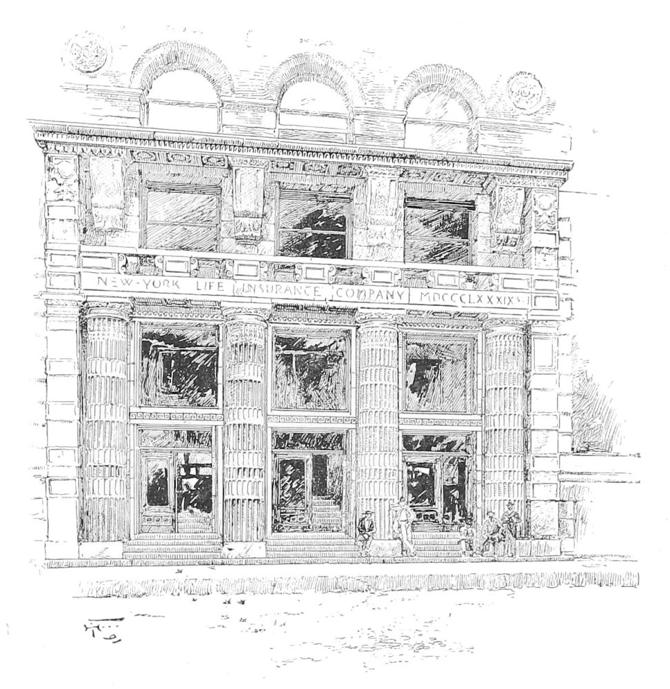 It seems to be an explicit expostulation, for example, with the architect of the Guaranty Loan Building in Minneapolis, which has many striking details not without ingenuity, and certainly not without “enterprise,” but as certainly without the refinement that comes of a studied and affectionate elaboration, insomuch that this also may be admitted to be W——n, and to invite the full force of Dryden’s criticism. The building in the exterior of which this mild remonstrance is made has an interior feature that is noteworthy for other qualities than the avoidance of indiscretion and overstatement—the “arcade,” so called, from which it takes its name—a broad corridor, sumptuous in material and treatment to the “palatial” point, one’s admiration for which is not destroyed, though it is abated, by a consideration of its irrelevancy to a business block. The building of the New York Life in Minneapolis, by the same architects as the building of the same corporation in St. Paul, is more readily recognizable by a New-Yorker as their work. It is a much more commonplace and a much more utilitarian composition—a basement of four stories, of which two are in masonry, carrying a central division also of four and an attic of two, the superstructure{200}