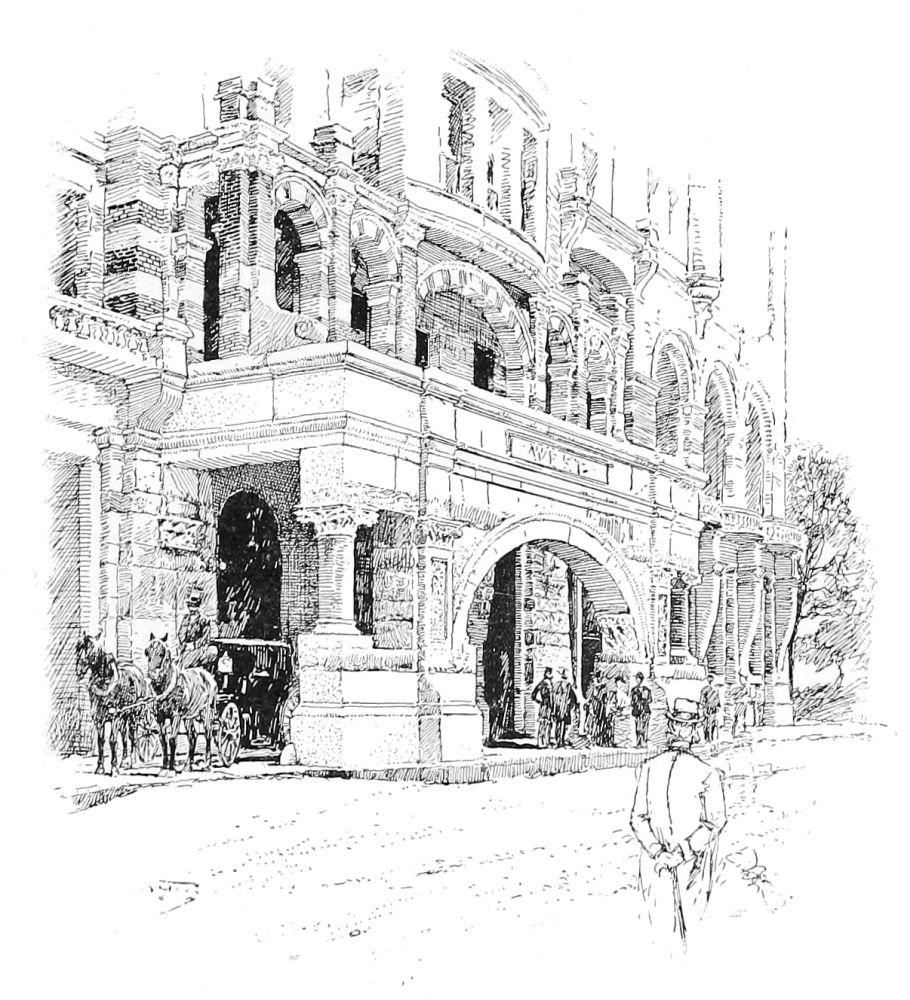 and he himself must speak through, saying thus, or to the same defect—Ladies, or fair ladies, I would wish you, or, I would request you, or, I would entreat you, not to fear, not to tremble: my life for yours. If you think I come hither as a lion, it were pity of my life. No. I am no such thing: I am a man as other men are:{45} and there, indeed, let him name his name; and tell them plainly he is Snug the joiner”—that is to say, Messrs. Peabody and Stearns, architects. The “other prologue,” which is calculated to reassure the most timid, is the treatment of the first floor, where a disclaimer of any offensive intention is made in the insertion between the openings of pairs of banded pilasters, between the capitals of which is inserted the novel and pleasing ornament of a key-stone. In order to make sure that they are not strong enough to do any harm, they are not only designed with much feebleness, but they are projected from the face of the wall they might otherwise be imagined to strengthen, and set upon brackets. Between these Renaissance pilasters are Romanesque entrance arches, in which there is a return to truculence of demeanor; but these are seen to be not entrances at all, but only innocent windows of bank parlors, and the real entrances under them, covered with trefoiled gablets in cast iron, are obviously harmless. It is quite fair to say that up to the top of the first story there is no design in the building, nothing that betrays any evidence of a general intention. But having built thus far in futile search of a motive and of a style, they came upon both, and built over this aimless and restless collection of inconsistent details a purposeful, peaceable, and consistent brick building, a series of powerful piers connected by and sustaining powerful arches, defined by a light label moulding, and enriched at the springing with a well-designed belt of foliage. It seems incredible that the authors of this respectable building should be also the authors of the basement on which it stands. At the angle is the ingenious device of a griffin “displayed,” and with one wing folded back against either wall, to carry the metal socket of the flag-staff. This feature in all its details{46} is designed with great spirit and picturesqueness. But the architectural impulse fails in the attic story, which should obviously be here the richest part of the building, and which is the baldest, being only a series of rectangular holes, without either modelling or decoration, and without relation in their grouping to the openings immediately under them.