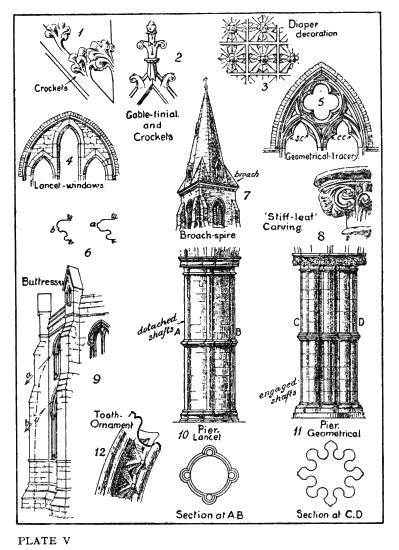 Plate V., Fig. 7, shows a tower with a broach-spire belonging to the Early English period. In the figure the four broaches are the small pyramids covering the squinch arches or squinch corbels, which carried four of the eight sides of the octagonal spire across the angles of the tower.