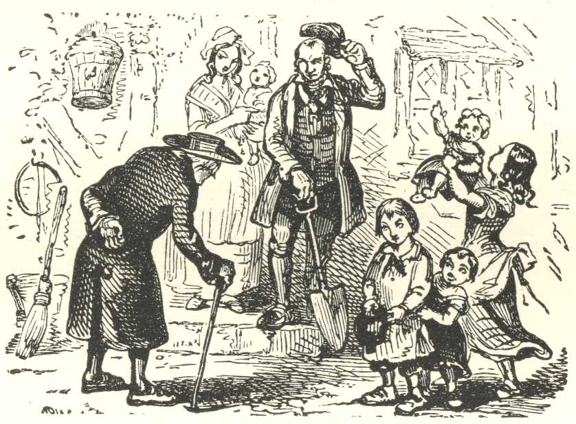 Not confining himself to a mere verbal description of his grandson’s abilities, Mr. Weller, when tea was finished, invited him by various gifts of pence and halfpence to smoke imaginary pipes, drink visionary beer from real pots, imitate his grandfather without reserve, and in particular to go through the drunken scene, which threw the old gentleman into ecstasies and filled the housekeeper with wonder. Nor was Mr. Weller’s pride satisfied with even this display, for when he took his leave he carried the child, like some rare and astonishing curiosity, first to the barber’s house and afterwards to the tobacconist’s, at each of which places he repeated his performances with the utmost effect to applauding and delighted audiences. It was half-past nine o’clock when Mr. Weller was last seen carrying him home upon his shoulder, and it has been whispered abroad that at that time the infant Tony was rather intoxicated. [306]
