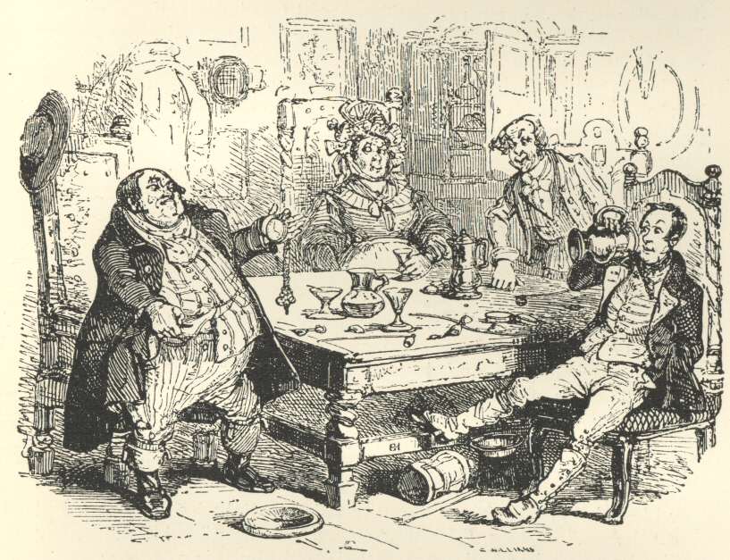 He was a very substantial citizen indeed. His face was like the full moon in a fog, with two little holes punched out for his eyes, a very ripe pear stuck on for his nose, and a wide gash to serve for a mouth. The girth of his waistcoat was hung up and lettered in his tailor’s shop as an extraordinary curiosity. He breathed like a heavy snorer, and his voice in speaking came thickly forth, as if it were oppressed and stifled by feather-beds. He trod the ground like an elephant, and eat and drank like—like nothing but an alderman, as he was.
