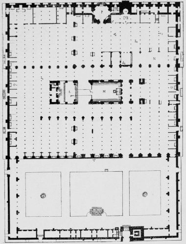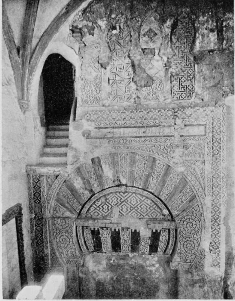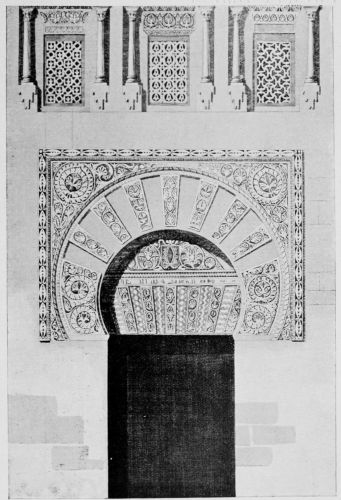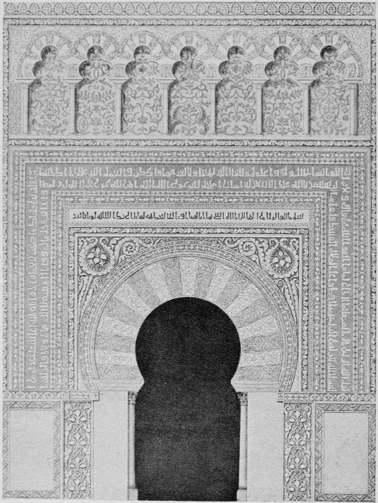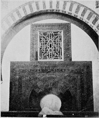 [4] The mih-rab is a recess having a cavity within one of its walls, wherein stood that copy of the Koran held in highest veneration. The cavity also marked that point of the compass towards which stands the Ka’bah, the object of veneration at Mecca.