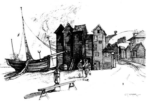 The grandest view of Hastings is that of the Old Town from hard by the modern, but picturesque, Lifeboat House, whence you see the great East Hill looming magnificently up above the huddled houses that, whether they be of old red brick or tarred wood, are all, in the mass, artistically “right.” It is, in the summer, a crowded quarter, for the excursionists who feel a little abashed by the stucco magnificences and primnesses of newer Hastings and St. Leonards, and cannot elsewhere come into close communion with the untamed sea, find here an ideal dumping-ground for babies and provision-baskets. Here, thanks to modern masonry groynes, a fine mass of264 beach is gradually accumulating, in heaped-up plenty.