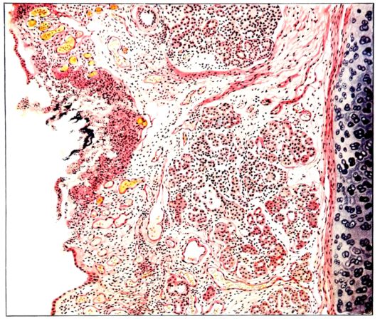 4. Simmonds (131), Bernhardt and Meyer (19) note that perichondritis may be present, but do not give a detailed description of the lesion. Gruber and Schädel (50) found this perichondritis to be associated with abscess formation.