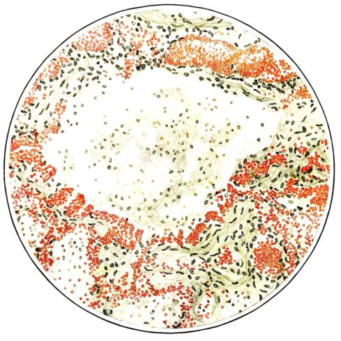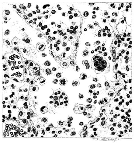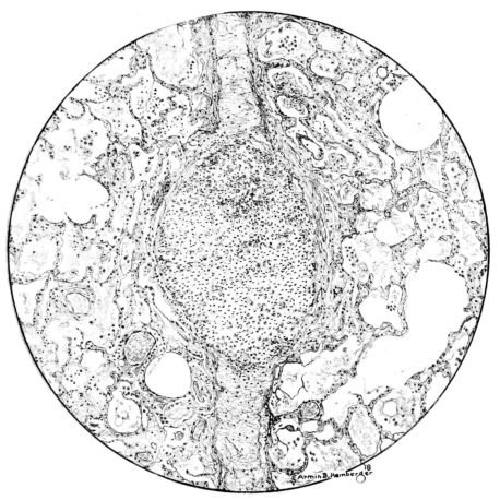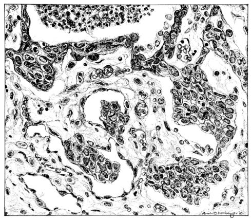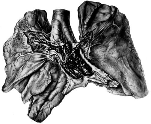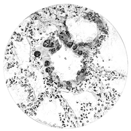During a period of about three months beginning with September 18, 1918, while the epidemic raged and waned in New Haven, there were approximately eleven hundred cases of the disease admitted to the New Haven Hospital. As is so often true, only the more critically ill sought hospital care, and few, if any, patients affected by other respiratory infections are included in these statistics. The mortality here, as elsewhere, was very high; of two hundred eighty (280) cases that ended fatally, eighty-two (82) were investigated at the post-mortem table. An attempt was made to make the studies very complete, and this was favored since the headquarters of the Yale Army Laboratory School, under the command of Colonel Charles F. Craig, were located at the Brady Laboratory where a large number of men were being instructed in Pathology and Bacteriology. It was also fortunate that competent illustrators were available who made a splendid series of water-colors and drawings of the characteristic lesions, both gross and microscopic.