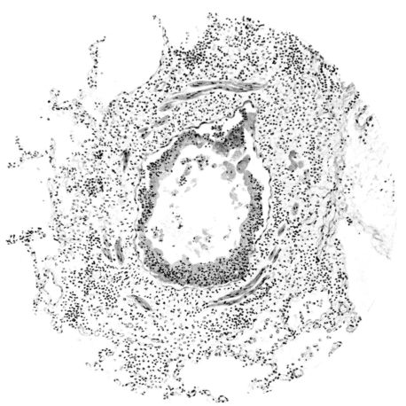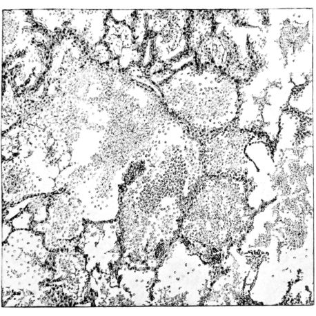 10. The types of consolidation described as having been encountered at the post-mortem table apparently vary somewhat with the locality and the interpretation of the observers. The lobar type has been frequently found by Opie et al (110), Wollstein and Goldbloom (164), Stone and Swift (138), and others. The pseudolobar pneumonia has been mentioned by Abrahams et al (2), Keegan (67), and Speares (135), while the peribronchial type has been well described by Hubschman, Glaus and Fritzsche (47), and MacCallum (92). Lobular pneumonia has been noted by all observers. The type of consolidation in this series has been tabulated in relation to the inflammatory reaction.