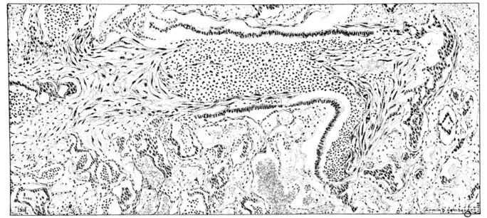 FIG. II. AUTOPSY NO. 98. DRAWING OF A SECTION THROUGH A TRACHEA SHOWING NECROTIZING HEMORRHAGIC INFLAMMATORY PROCESS OF THE MUCOSA.