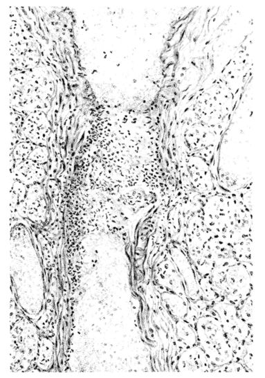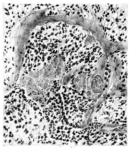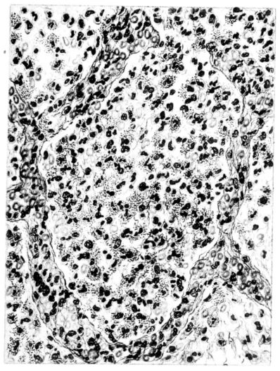 FIG. LV. AUTOPSY NO. 146. ACUTE HEMORRHAGIC ENTERITIS ASSOCIATED WITH MULTIPLE BACTERIAL EMBOLI IN THE CAPILLARIES OF THE INTESTINAL MUCOSA.