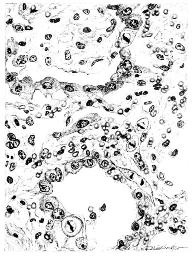 FIG. LVII. AUTOPSY NO. 150. ORGANIZATION OF THE INFLAMMATORY EXUDATE AND REGENERATION OF THE MUSCLE FIBERS AFTER AN ACUTE HEMORRHAGIC MYOSITIS. COMPARE FIGURE LVI.