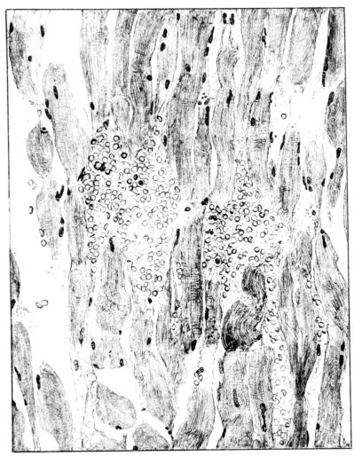 5. Two examples of fresh endocarditis are reported by Malloch (95) and one by Dietrich (34), all of which were due to B. influenzæ. Acute myocarditis was observed by Blanton and Irons (12) and Gruber and Schädel (50). Glaus and Fritzsche (47) report a case with multiple hemorrhages, necrosis, and leucocytic infiltration of the heart muscle and also one of Zenker’s degeneration of the myocardium. Cases of both myocarditis and endocarditis are included by Leichtenstern (82) in a review of the epidemic of 1889–1890.