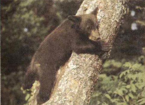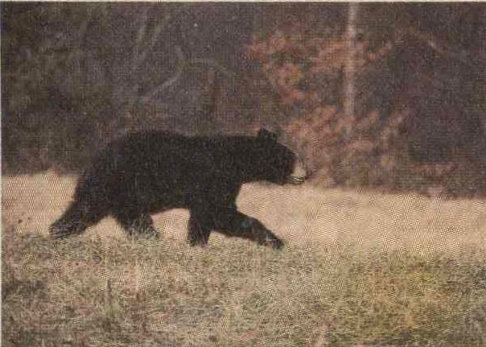 The black bear is the largest wild animal in these parts. It can weigh 225 kilograms (500 pounds) or more, but is capable of incredibly fast sprints on rough terrain. It is a wild animal, and protected as such it sometimes loses its normal fear of people. This makes the bear appear tame, but it is then actually more dangerous than its truly wild counterparts. If you come upon a bear while you are in your car, keep the windows shut. Do not attempt to feed, tease, molest, or get close to a bear. Do not try to take a closeup portrait photograph of a bear; either use a telephoto lens or be satisfied with a distant shot.