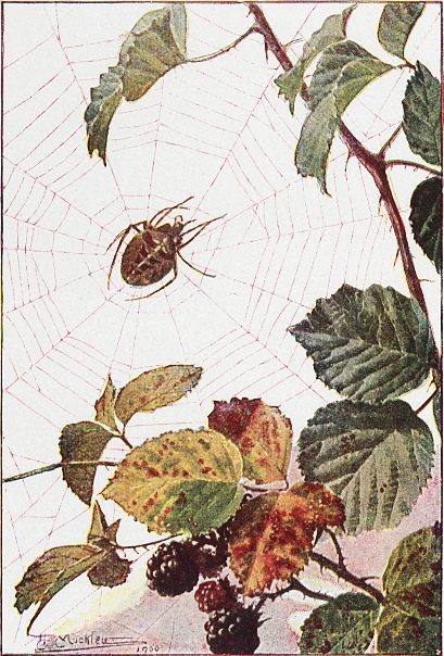 Außer den Geweben auf den Ginsterbüschen gibt es noch eine Menge anderer Gespinste auf der Gemeindeweide, die dicht am Boden sitzen. Diese haben keine Speichen wie die runden Gewebe. Die Fäden sind verworren wie bei der Schafwolle. Lange konnten wir die Spinne nicht finden. Endlich sagte Paul eines Tages: „Hier ist ein Loch gerade in der Mitte des Gewebes. Es führt hinunter in die Erde.“