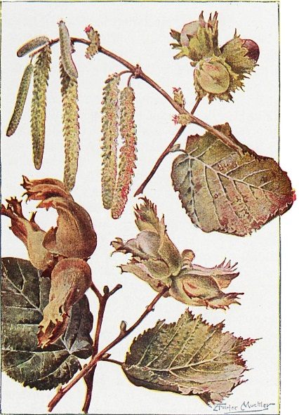 Wir wissen, daß sich aus diesen roten Blüten die Nüsse bilden, denn im September finden wir die Nüsse gerade an ihrer Stelle. Wenn der Wind den gelben Staub aus den Kätzchen weht, so fällt etwas davon auf die roten Hörner der Blüten, und dies bewirkt, daß sich Nüsse entwickeln.