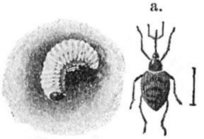 a. Der Rüsselkäfer vergrößert; der Strich daneben gibt die