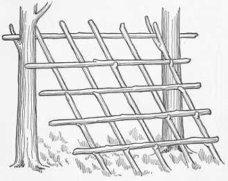 The first thing to be considered on going into the forest is the camp where the night is to be spent. In choosing a place for this see that there is fresh water, wood for the fire and brush-wood for building a "lean-to," or hut, at hand. It is well to build on a dry, level place, with just enough slope to the ground to insure the water running away in case of rain. The Indians used to live in huts thatched with brush-wood, and these are best made by building what is known as a "lean-to." Look for two trees standing from eight to ten feet apart on your camping place, with branches from six to eight feet above the ground. By placing a pole from one tree to the other in the crotches and leaning other poles against this one, brush-wood can be woven in to form a very good roof. Branches of the balsam or hemlock are best for this purpose, and the needles should point down. It is well to collect as many soft, thick tips of trees of this character as possible, both for the thatching and to make the beds.[11] Cover the floor of the "lean-to" with these tips thickly and lay the rubber blankets on top, rubber side down. Be sure to make the head of your bed toward the inside and away from the opening. You will find that this makes a very comfortable bed.