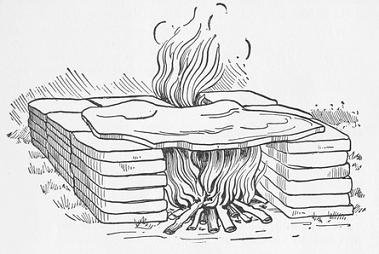 Take every care to prevent the spreading of the fire, and do not build it too close to the tent or to inflammable pine trees. There is always danger of starting a disastrous forest fire by carelessness with a small camp fire. Remember that it is criminal to leave a burning fire, and always to put the fire out with water or earth. If the fire is to be used for cooking, it is well to confine the heat between two large logs, or, if baking is to be done on it, it is best to build an oven with large stones. But the Indians were usually content with open fire.