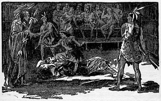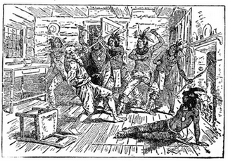 It is believed, though it is not certain, that Osceola was the leader in this terrible affair. If so, he did another thing,[223] which, in its way, was equally startling. His enmity toward General Thompson, who had put him in irons, was intense. On the same day that the Dade massacre took place, Thompson was dining in a house within a short distance of Fort King. Seated at the table with him were several gentlemen; and, as the day was unusually warm, even for that latitude, the sashes were raised. In the midst of the meal, and while all were chatting and laughing, a volley came through the windows, and Osceola, at the head of a party of Seminoles, dashed into the room with tomahawks upraised. Five guests leaped out of the windows, and, running at headlong speed, reached the fort. The others made for a hummock near by, but were shot down on the way. Five in all, including General Thompson, were killed. The cook, a negro woman, hid behind a barrel and was not noticed. Those who fell were scalped, and Osceola, uttering his well-known defiant cry, made off with his companions, before the garrison at the fort could interfere.