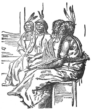 Black Hawk silently returned the pressure, and looked in the face of Keokuk with a world of pathos in his gloomy features. As he still remained silent, too depressed to find words, Keokuk began asking him questions about his journey home. Then pipes were brought out, and all smoked and chatted for an hour or more. A more formal reception[218] took place on the morrow, when Keokuk returned and the grand council was held. There was some friction during the speaking, in which the commandant of the fort took part, but in the end all was made smooth, and Black Hawk finally left for his wigwam, with expressions of good will toward all, including the chief who had supplanted him.