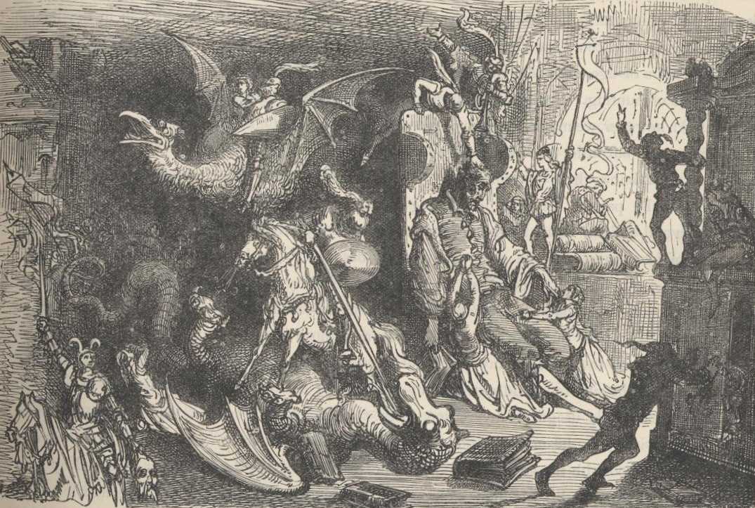 The book cover and spine above and the images which follow were not part of the original Ormsby translation—they are taken from the 1880 edition of J. W. Clark, illustrated by Gustave Dore. Clark in his edition states that, "The English text of 'Don Quixote' adopted in this edition is that of Jarvis, with occasional corrections from Motteaux." See in the introduction below John Ormsby's critique of both the Jarvis and Motteaux translations. It has been elected in the present Project Gutenberg edition to attach the famous engravings of Gustave Dore to the Ormsby translation instead of the Jarvis/Motteaux. The detail of many of the Dore engravings can be fully appreciated only by utilizing the "Enlarge" button to expand them to their original dimensions. Ormsby in his Preface has criticized the fanciful nature of Dore's illustrations; others feel these woodcuts and steel engravings well match Quixote's dreams. D.W.