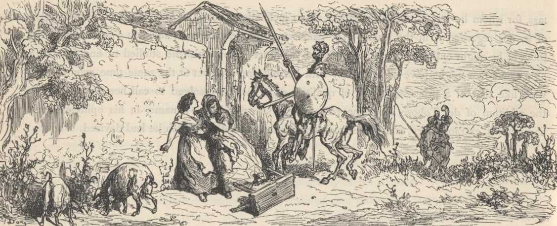 It is strange that this element of incongruity, underlying the whole humour and purpose of the book, should have been so little heeded by the majority of those who have undertaken to interpret "Don Quixote." It has been completely overlooked, for example, by the illustrators. To be sure, the great majority of the artists who illustrated "Don Quixote" knew nothing whatever of Spain. To them a venta conveyed no idea but the abstract one of a roadside inn, and they could not therefore do full justice to the humour of Don Quixote's misconception in taking it for a castle, or perceive the remoteness of all its realities from his ideal. But even when better informed they seem to have no apprehension of the full force of the discrepancy. Take, for instance, Gustave Dore's drawing of Don Quixote watching his armour in the inn-yard. Whether or not the Venta de Quesada on the Seville road is, as tradition maintains, the inn described in "Don Quixote," beyond all question it was just such an inn-yard as the one behind it that Cervantes had in his mind's eye, and it was on just such a rude stone trough as that beside the primitive draw-well in the corner that he meant Don Quixote to deposit his armour. Gustave Dore makes it an elaborate fountain such as no arriero ever watered his mules at in the corral of any venta in Spain, and thereby entirely misses the point aimed at by Cervantes. It is the mean, prosaic, commonplace character of all the surroundings and circumstances that gives a significance to Don Quixote's vigil and the ceremony that follows.