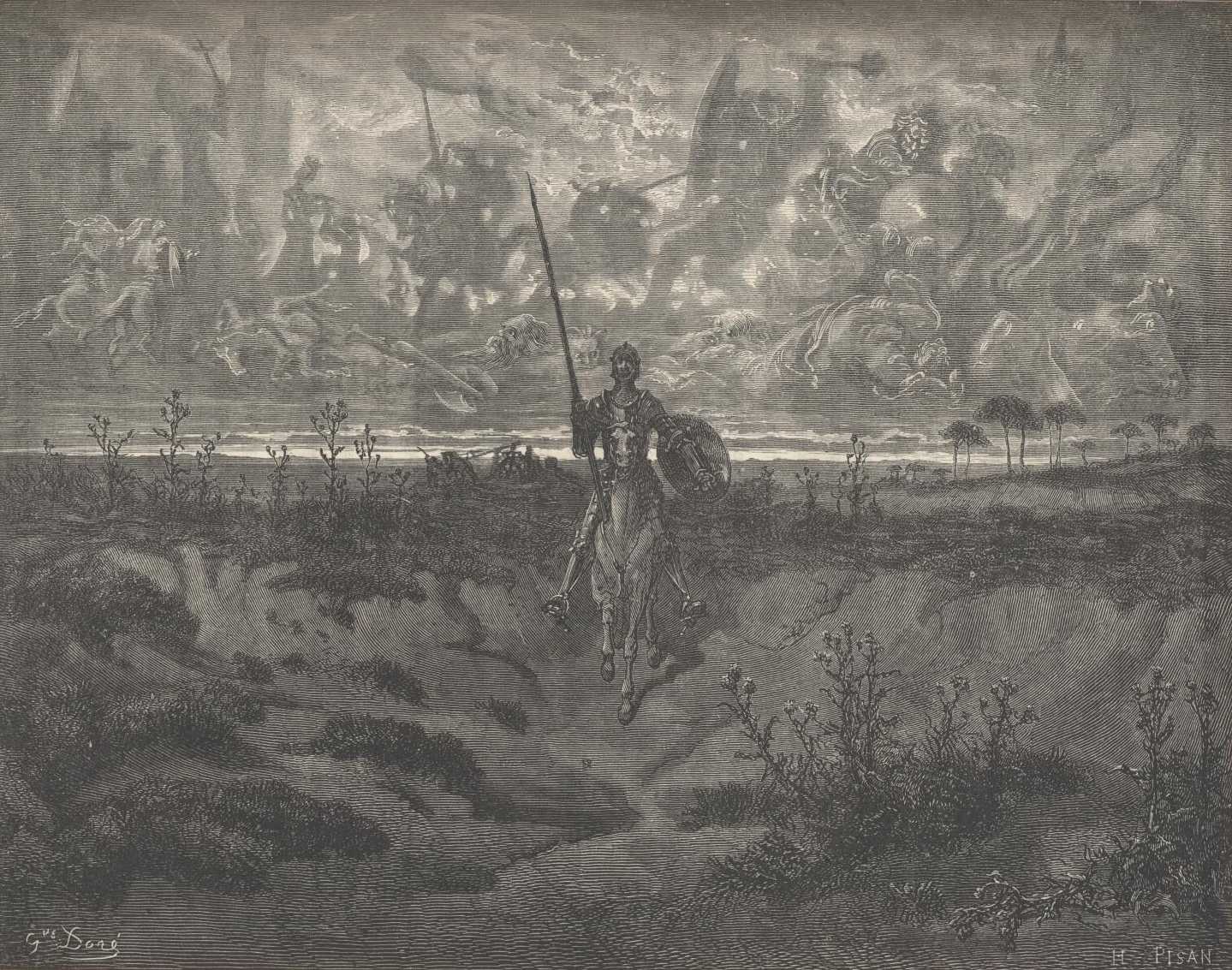 These preliminaries settled, he did not care to put off any longer the execution of his design, urged on to it by the thought of all the world was losing by his delay, seeing what wrongs he intended to right, grievances to redress, injustices to repair, abuses to remove, and duties to discharge. So, without giving notice of his intention to anyone, and without anybody seeing him, one morning before the dawning of the day (which was one of the hottest of the month of July) he donned his suit of armour, mounted Rocinante with his patched-up helmet on, braced his buckler, took his lance, and by the back door of the yard sallied forth upon the plain in the highest contentment and satisfaction at seeing with what ease he had made a beginning with his grand purpose. But scarcely did he find himself upon the open plain, when a terrible thought struck him, one all but enough to make him abandon the enterprise at the very outset. It occurred to him that he had not been dubbed a knight, and that according to the law of chivalry he neither could nor ought to bear arms against any knight; and that even if he had been, still he ought, as a novice knight, to wear white armour, without a device upon the shield until by his prowess he had earned one. These reflections made him waver in his purpose, but his craze being stronger than any reasoning, he made up his mind to have himself dubbed a knight by the first one he came across, following the example of others in the same case, as he had read in the books that brought him to this pass. As for white armour, he resolved, on the first opportunity, to scour his until it was whiter than an ermine; and so comforting himself he pursued his way, taking that which his horse chose, for in this he believed lay the essence of adventures.