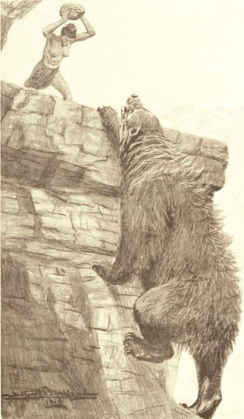 Honk-Ah was upon his feet, he had heard the titter of the women behind him, he had looked towards one and another of his chosen friends and followers, but had failed in finding an answering eye, he felt himself slipping, the situation called for instant action, he took it with a rush, there was no finesse about Honk-Ah. He struck his hardest at his opponent's weakest spot—this tale was too wonderful for belief. He appealed to the experience of the old chief and the half dozen elders, he claimed as a brave to know something, he and his contemporaries had seen a bear or two die, but they had died hard, had charged home a dozen times, had run, when it came to running, for a long way, had stood at bay under a storm of spears for half a day: it had taken every man of the hunting party all that he knew to finish the fight with a whole skin.[Pg 252] Yet, this foreign woman, forsooth, had killed her bear, an Old Man Grizzly (there was no getting over that skin) with a casual poke with one—one—of her people's stupid little darts. Absurd! That the bear had died was evident—even bears cannot live forever; but, how had he died?—In a pit? or under a down-fall? or by a chance-fallen rock, perhaps? Such things did happen to bears as to men, he supposed. And doubtless this had befallen whilst Pŭl-Yūn lay sick, and—well—it was only too plain that his cousin had been very sick indeed, both in his feet and in his head, for in a word, this foreign woman had fooled him.