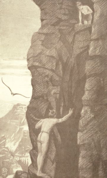 With infinite precaution she lowered herself to a ledge a few feet beneath her, crawled, leaned and peeped; farther and yet farther she craned for a view, and—there he was!—She found herself overlooking the brow of a cave, a fissure in the limestone, and there, at the cave's mouth, sate her enemy!