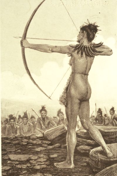 Dêh-Yān fitted arrow to string and half bent the great bow, still keeping her eye upon the tiny mark, then with a small sweet laugh she tripped back from the throwing-crease five full strides, drew swiftly and to the ear and as swiftly loosed. Twang! the cord sang shrill in the morning air, the arrow sped, and a whoop of sheer delight broke from the watching tribe, for the shaft had struck the mitten full, had pierced and transfixed it. The archer had watched the flight of her shaft with a hard bright eye, now she turned and tripped back to her husband's side without a side-glance, as if such marksmanship was all in her day's work, a thing of nought. Doubt not that her little heart was high within her bosom, but no vaunting word escaped her lips. Dêh-Yān was great.