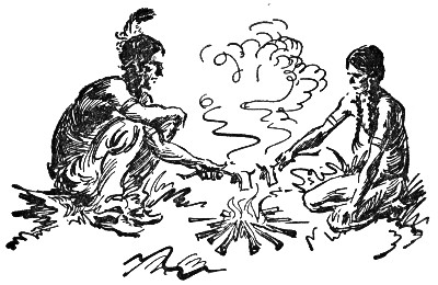 Bent Arrow followed the medicine man into the tepee. Clawing Bear sat near the fire and motioned Bent Arrow to sit beside him. The boy sat quietly while the medicine man selected a pipe, filled it, and lighted it with a brand from the fire. Clawing Bear inhaled deeply, and slowly blew the smoke to the east. After a pause, he took a second puff and blew it to the south. In the same way he blew smoke to the west and to the north. Then he laid the pipe aside.